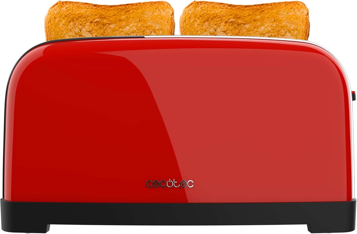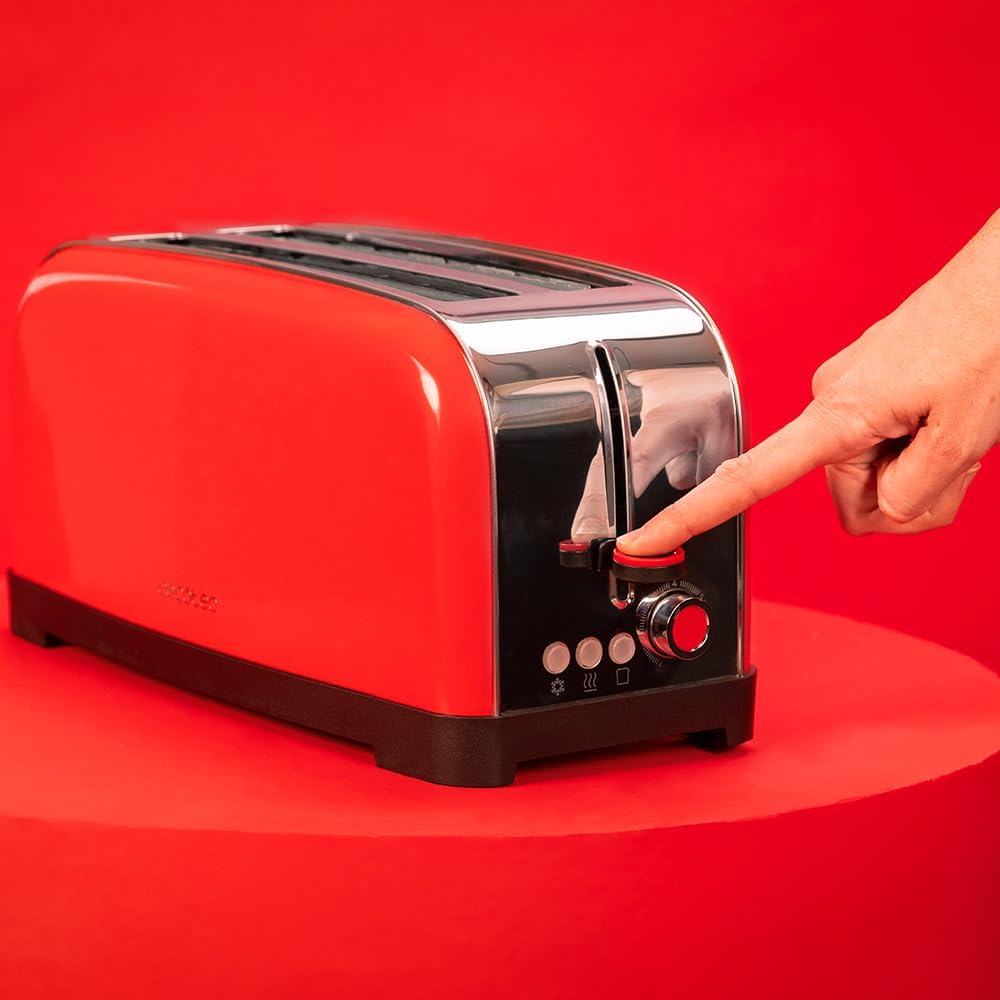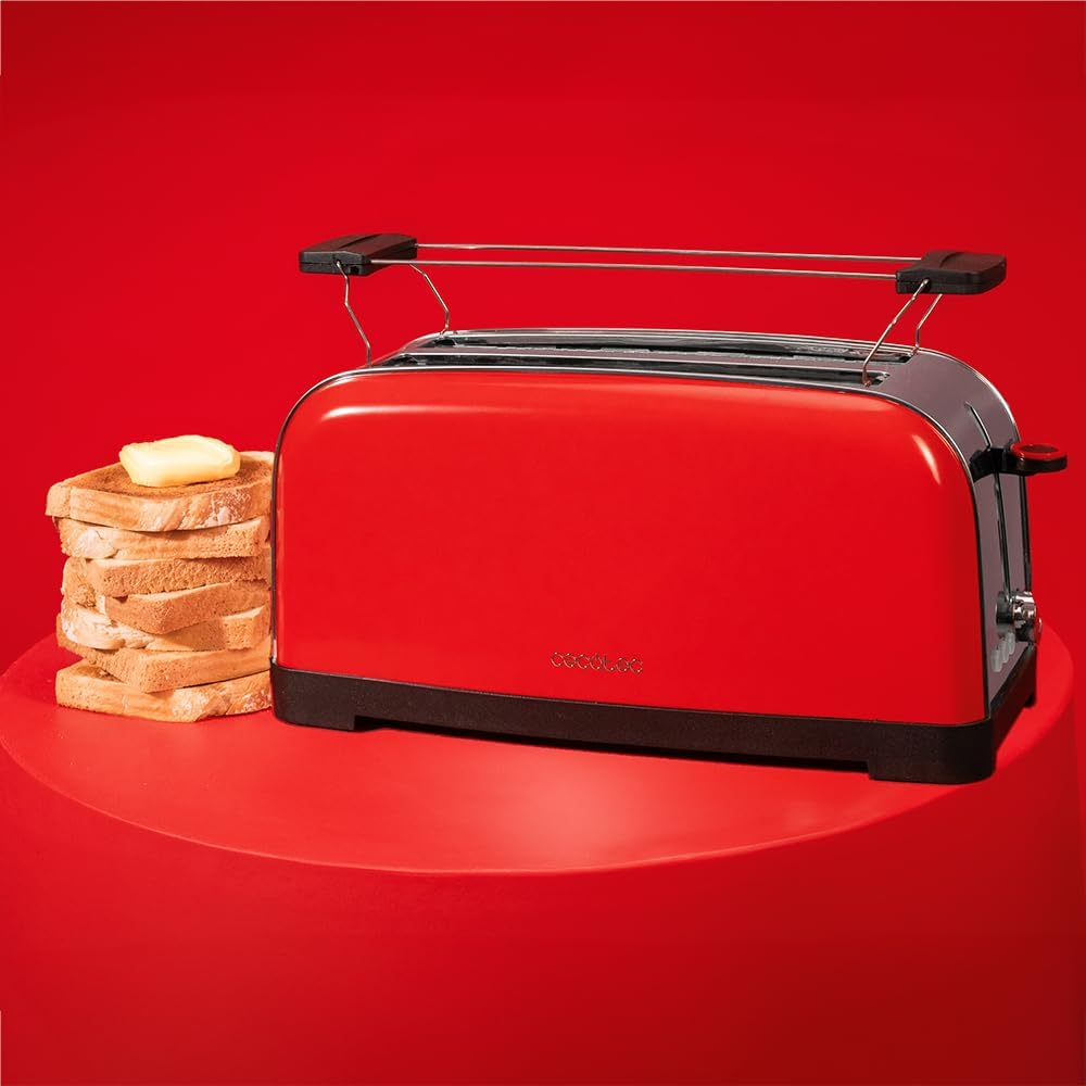 Вертикален тостер Cecotec с 2 дълги отвора Toastin' Time 1500 Red. 1500 W, 4 филийки хляб, отвор с ширина 3,8 см, подгряване на хлебчета и тавичка за трохи, неръждаема стомана и червено.