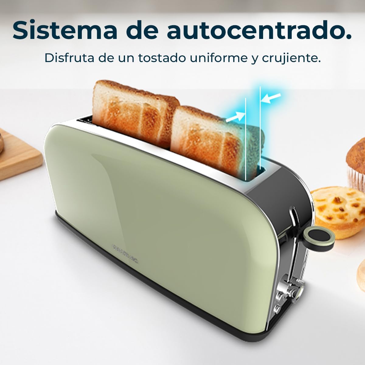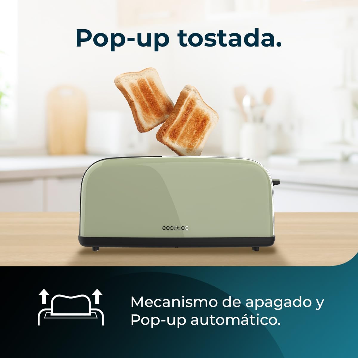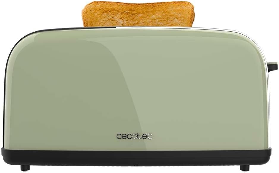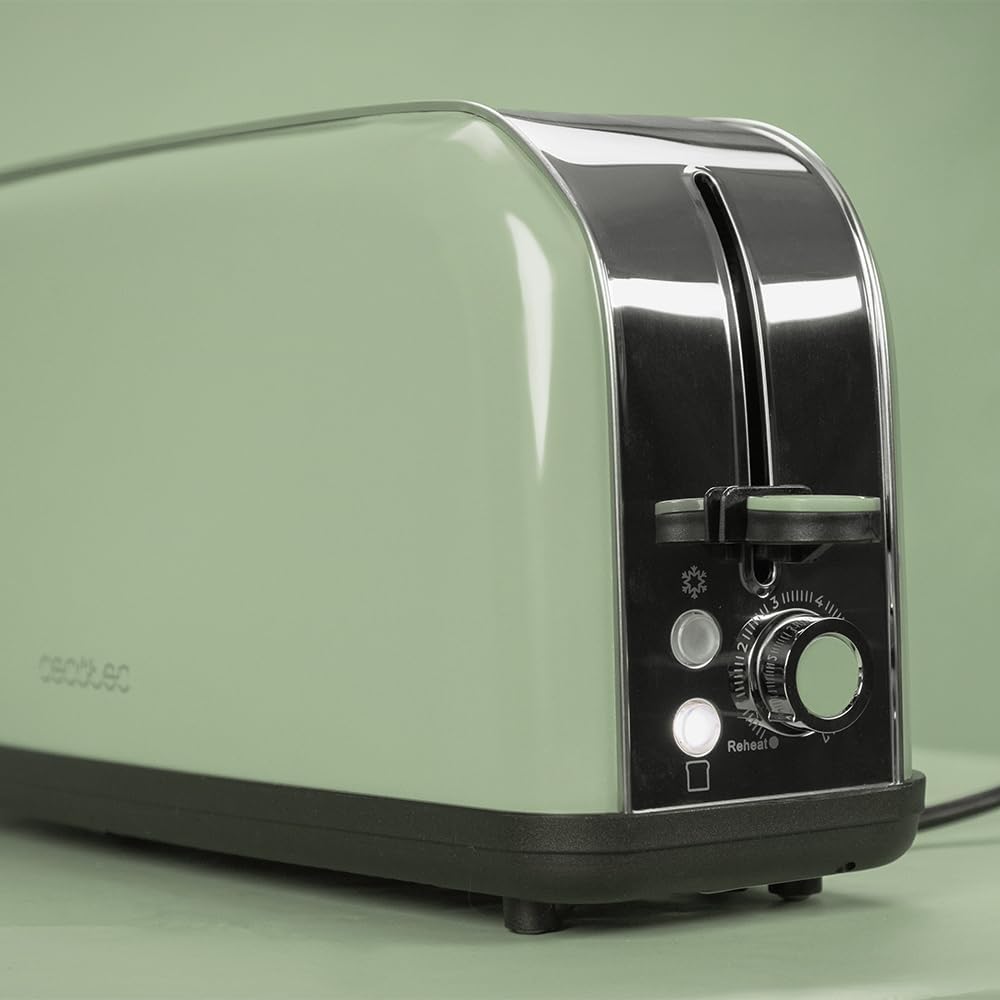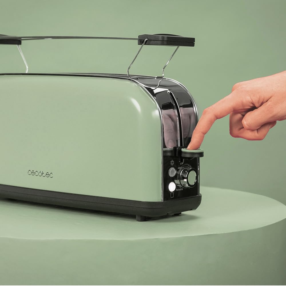 Вертикален тостер Cecotec Toasting' time 850 Green Long, 850W, Двоен дълъг и широк отвор 3.8 см, Горни решетки, Неръждаема стомана, Автоматично изключване и функция за изскачане, Тава за трохи