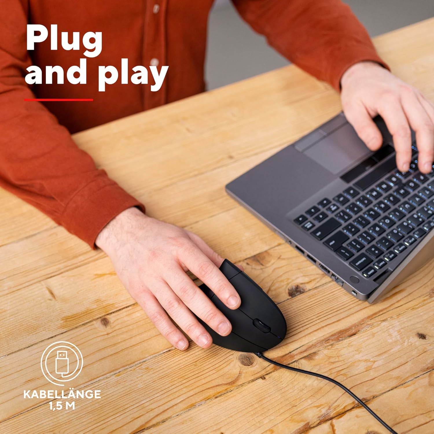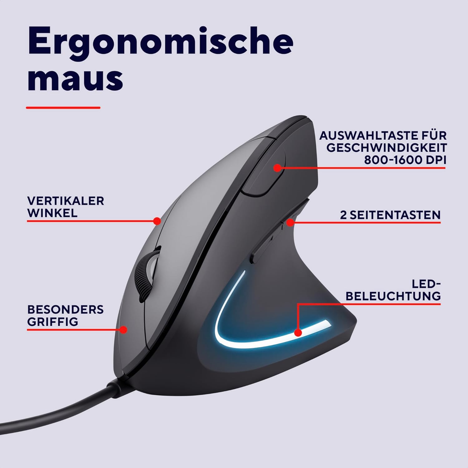 Вертикална ергономична мишка Trust Verto, предотвратяване на синдром на тенис лакътя/ръката на мишката (RSI синдром), 1000/1600 DPI, LED осветление, кабелна компютърна мишка за десничари, компютър, лаптоп, Mac - черна