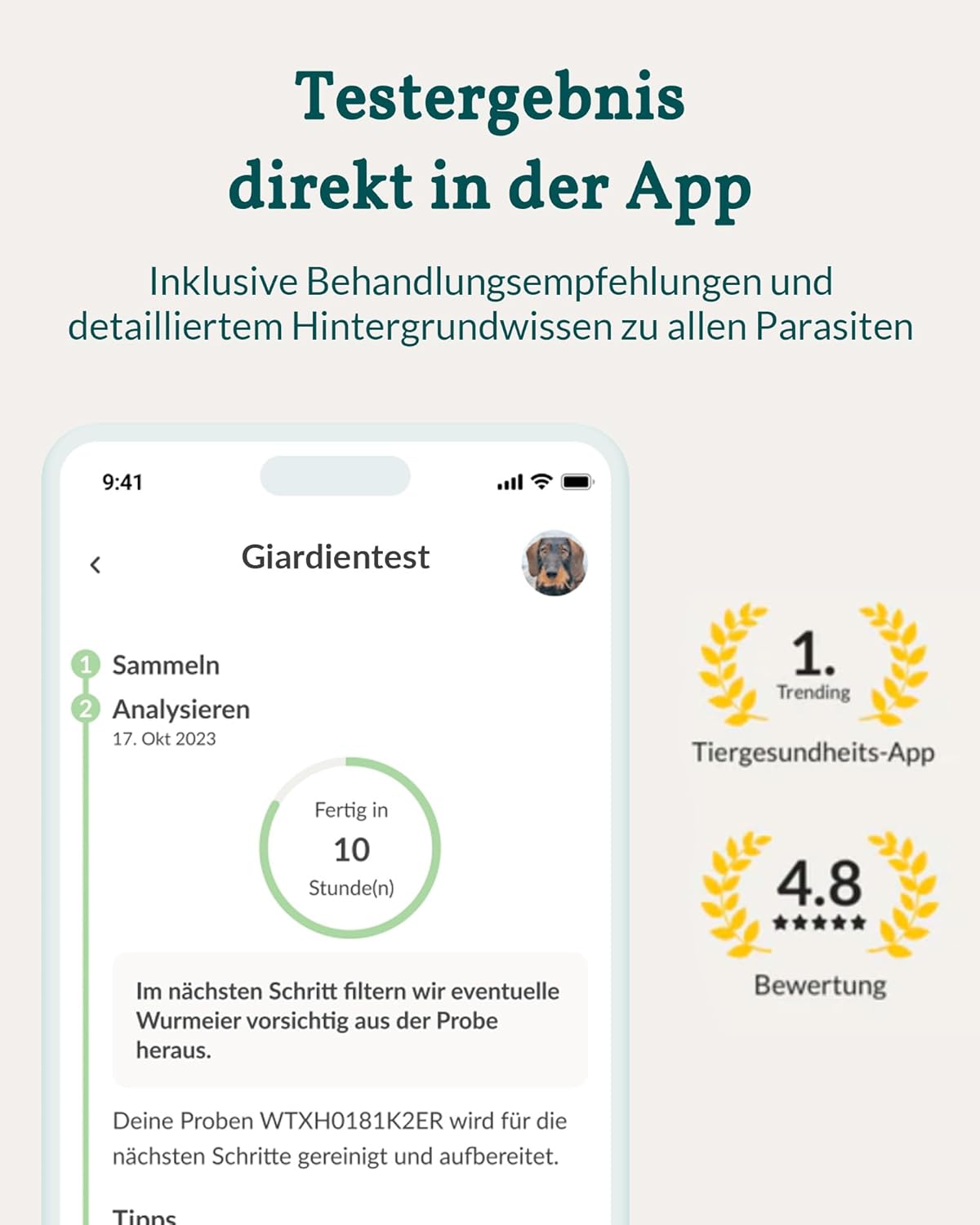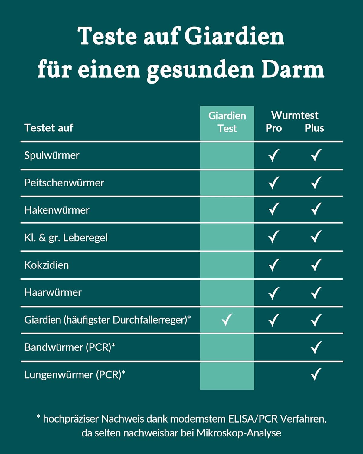 • Тест за Giardia: Giardia са микроорганизми, считани за една от най-честите причини за диария при кучета и котки. В Германия приблизително 10% от възрастните животни и до 75% от кученцата са засегнати.