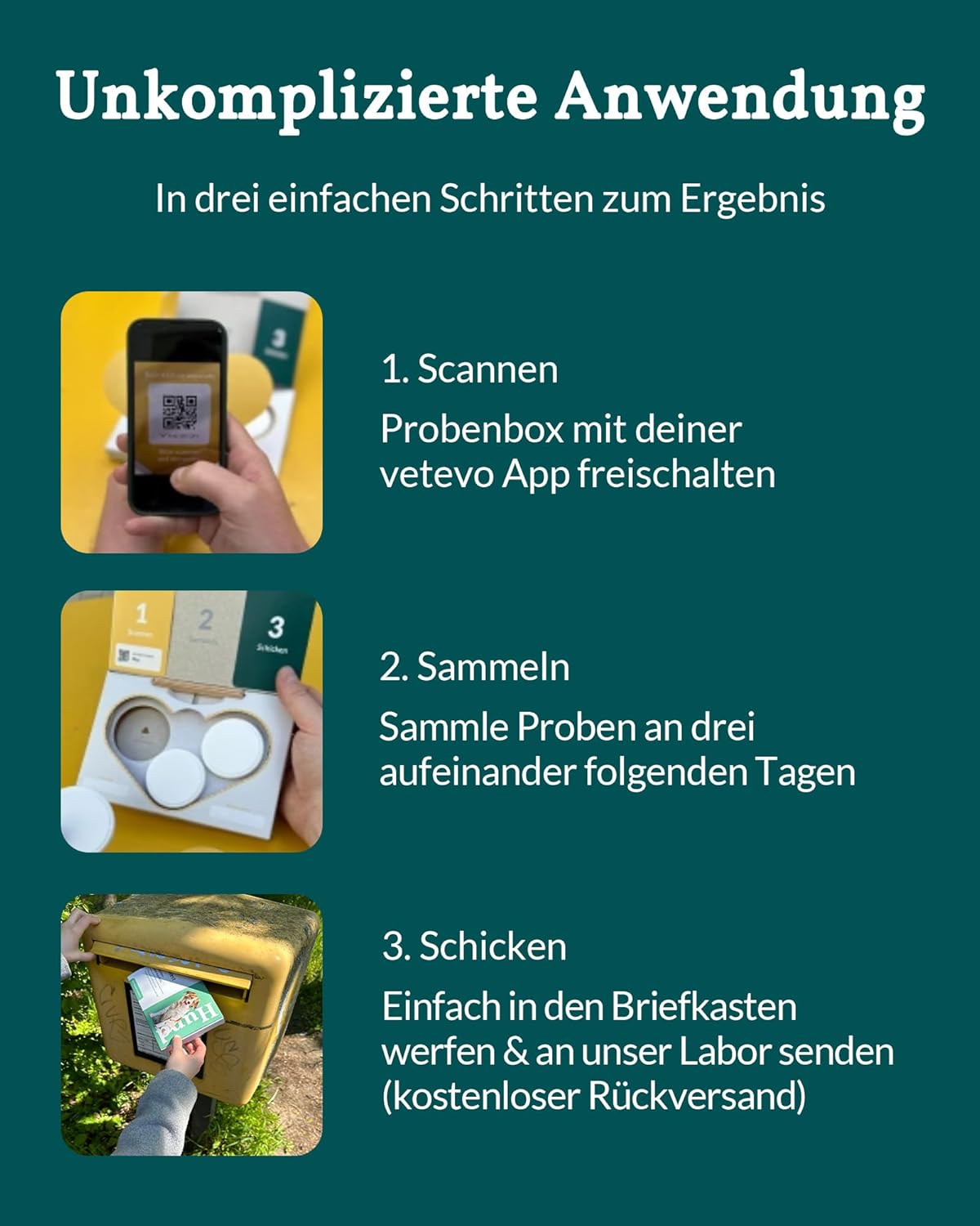 • Лесен за употреба: Нашият тест, който се извършва без усилие у дома в 3 прости стъпки, дава бързи резултати - 1. Сканирайте QR кода, 2. Вземете 3 проби в последователни дни, 3. Изпратете ги безплатно в лабораторията.