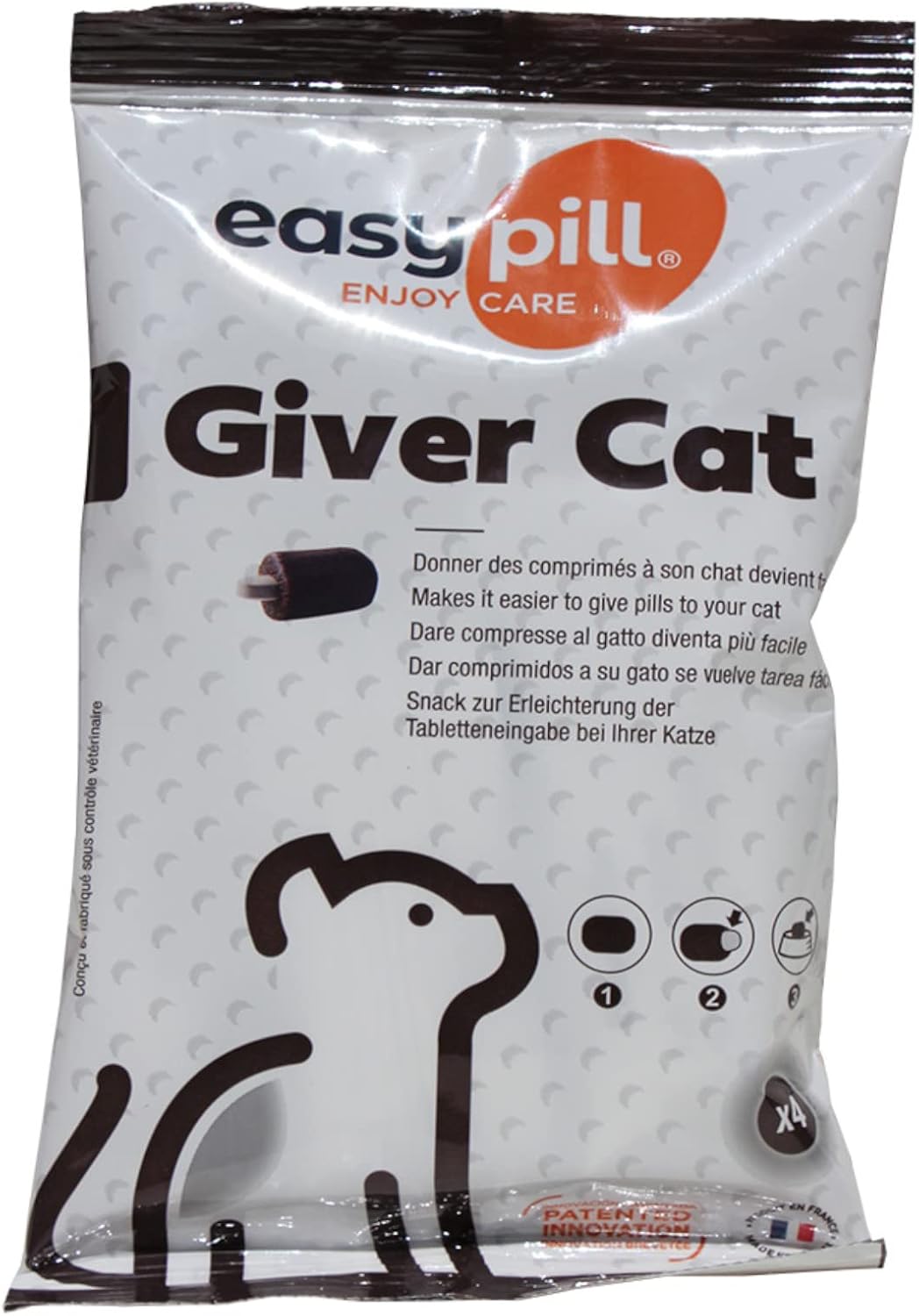 Easypill Cat 2 x 4 x 10g Снакс за вкусно приложение на таблетки. Предложете на котката си таблетката, покрита с EASYPILL, директно от ръката си или поставете снакса в купичката ѝ за храна. Котките развиват хранителните си навици много рано, поради което често упорито отказват да приемат таблетки. Следният подход като цяло се е доказал като ефективен: При следващото хранене предложете на котката си едно хапване без таблетка. Ако я изяде, опитайте да ѝ дадете едно хапване с таблетка, последвано от още две хапвания без таблетки. Забележка: Прилагането на това на котки с храносмилателни проблеми, особено повръщане, диария или запек, трябва да се извършва само след консултация с ветеринарен лекар. EASYPILL Cats е допълваща храна, а не пълноценна храна.