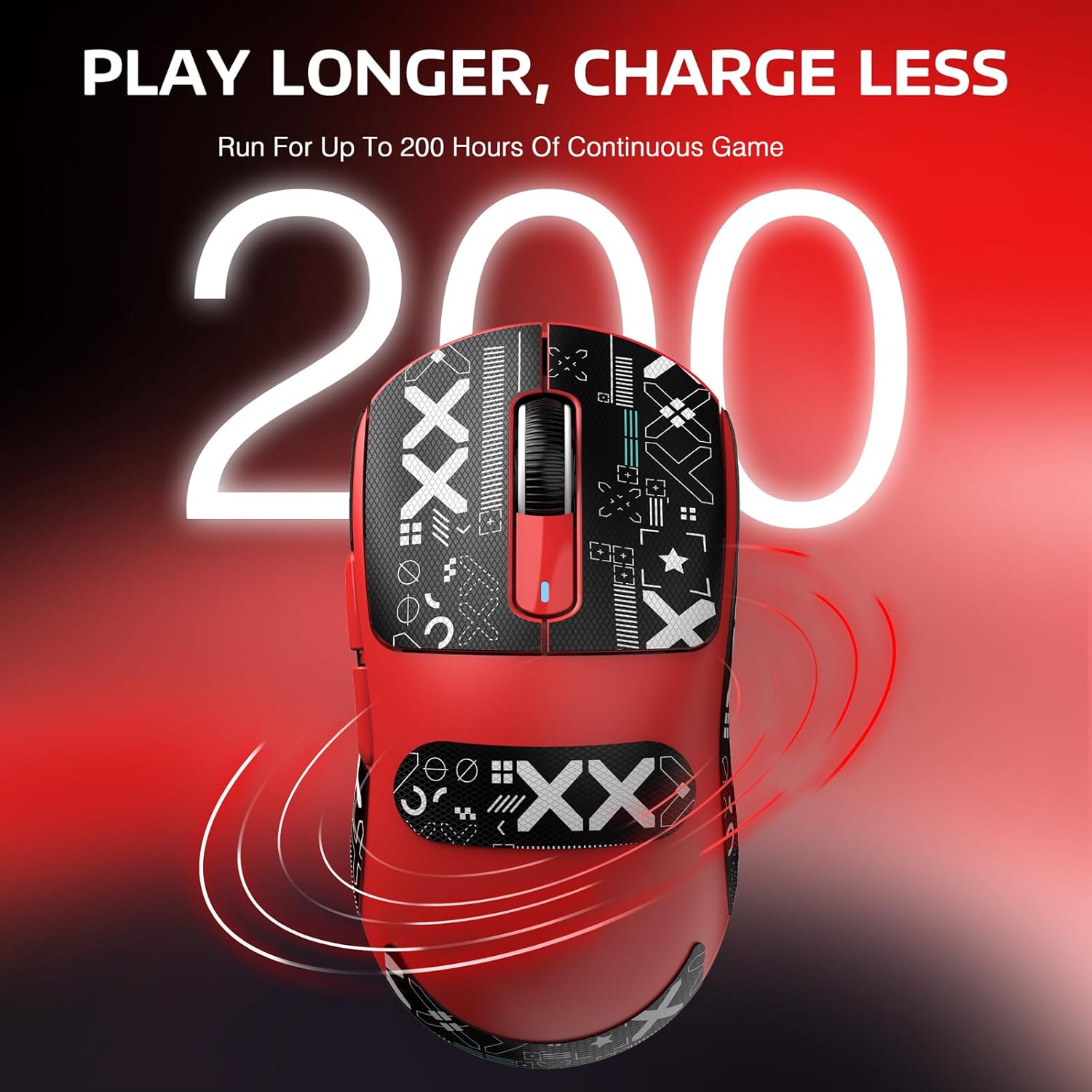 • 100% чист PTFE и супер дълъг живот на батерията: тези първокласни крачета за мишка, изработени от PTFE без добавки, са изключително издръжливи и осигуряват на мишката ви най-трайното плъзгане, като същевременно осигуряват по-добра производителност при спиране. Благодарение на микроконтролера Broadcom и отличното енергийно решение, безжичната геймърска мишка X3 може да осигури до 200 часа време за игра, еквивалентно на цяла седмица игра с едно зареждане.