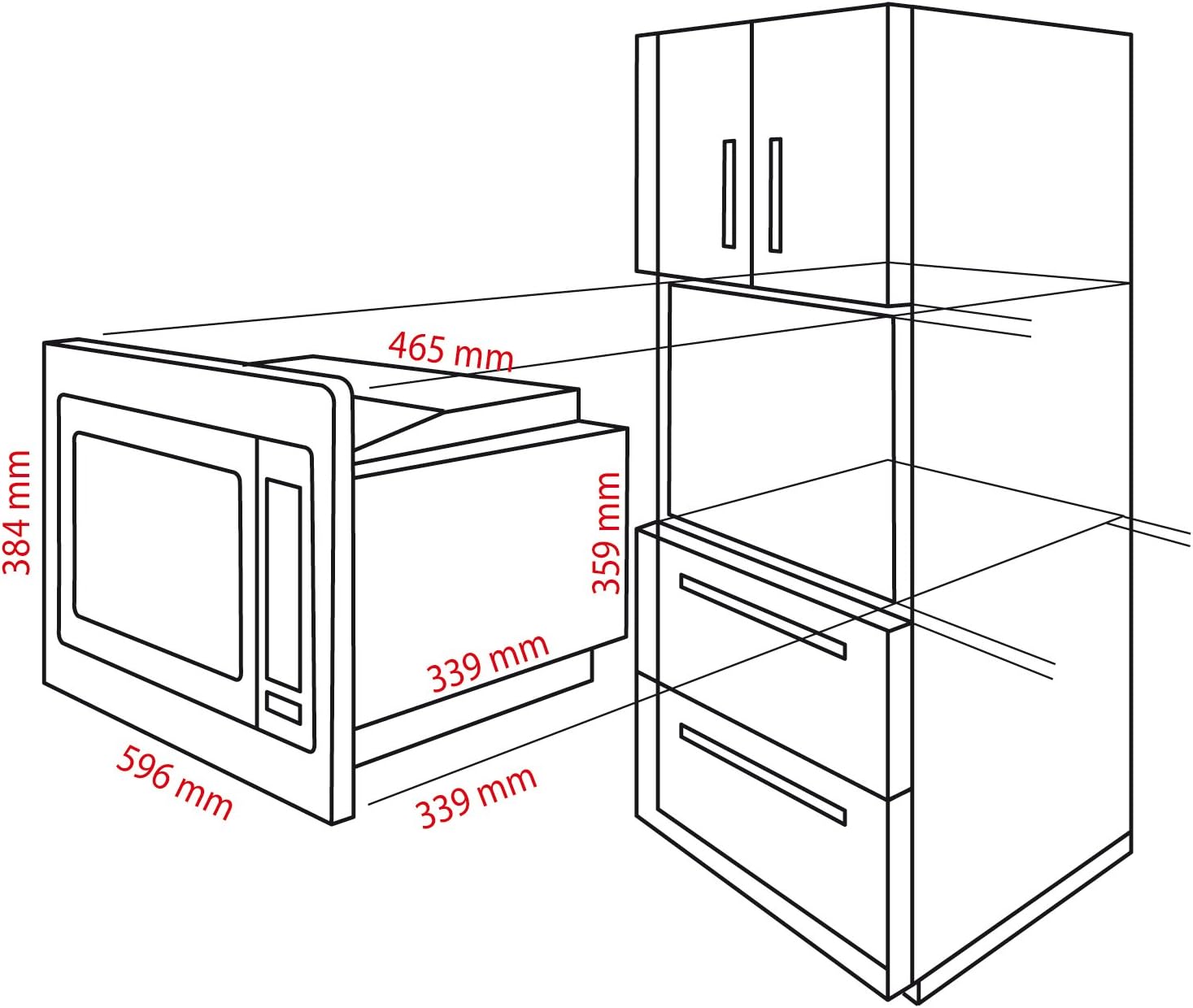 Вградената микровълнова фурна, включително рамката, е с ширина 596 мм, височина 384 мм и дълбочина 339 мм. Размерите без рамката са: Ш x В x Д 465 x 359 x 339 мм.