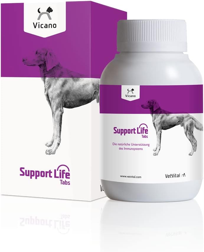 VetVital Vicano Support Life е специално разработена допълнителна храна за кучета, предлагаща разнообразие от натурални съставки. Формулата съдържа сибирски женшен, който може да допринесе за поддържане на здрава имунна система. Белият трън може да подпомогне естественото здраве на клетките. Броколито и други билкови съставки осигуряват основни витамини като витамин C, витамини от група В и фолиева киселина. Тази допълнителна храна е идеална за кучета от всички възрасти и може лесно да се прилага чрез смачкване на таблетките с храната или като се дават с лакомство.