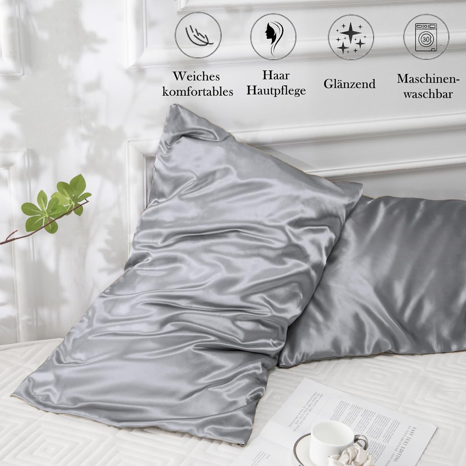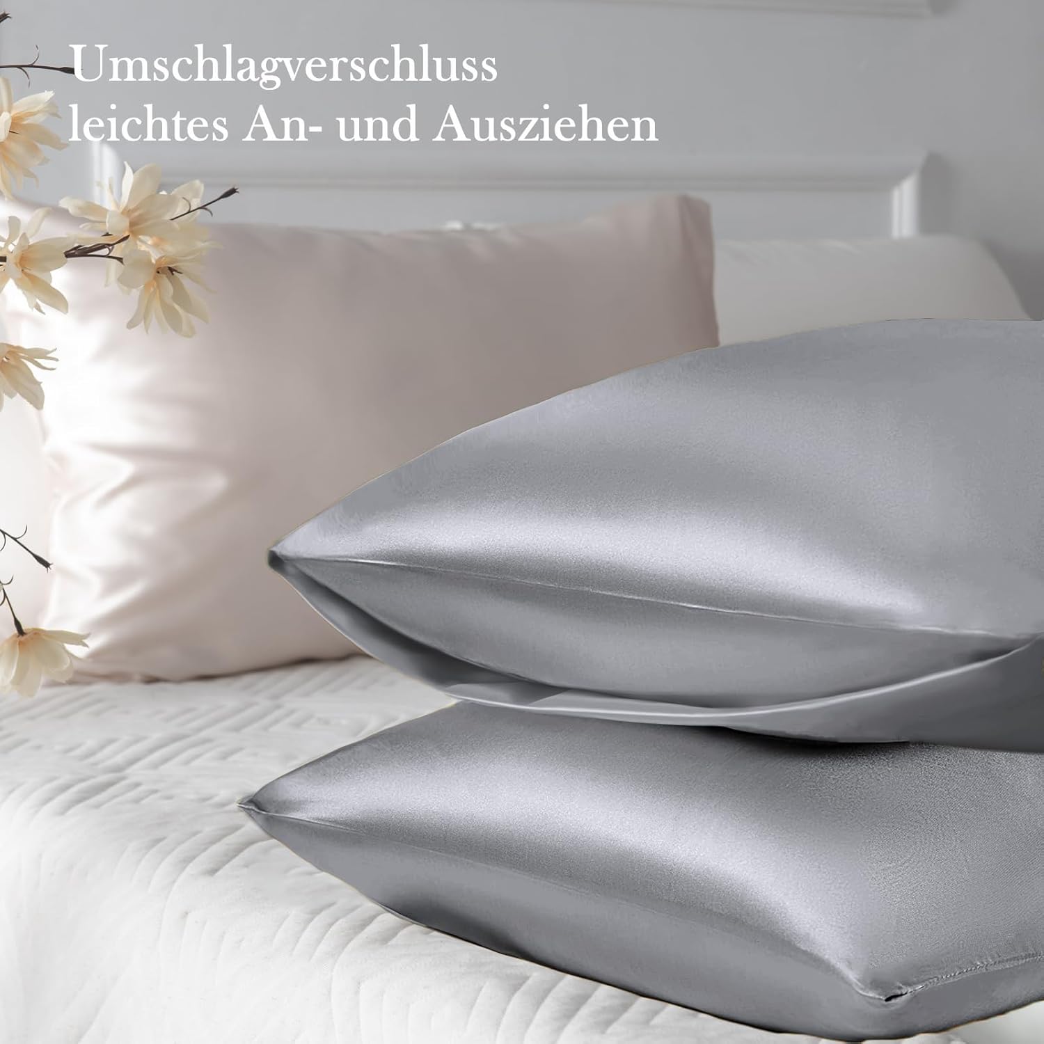 Vielit Комплект от 2 сатенени калъфки за възглавници, 40 x 60 см, Сиви, Меки като коприна, По-добра грижа от копринената калъфка за възглавница, Сатенена калъфка за възглавница за коса и кожа, Включва 2 топчета за коса