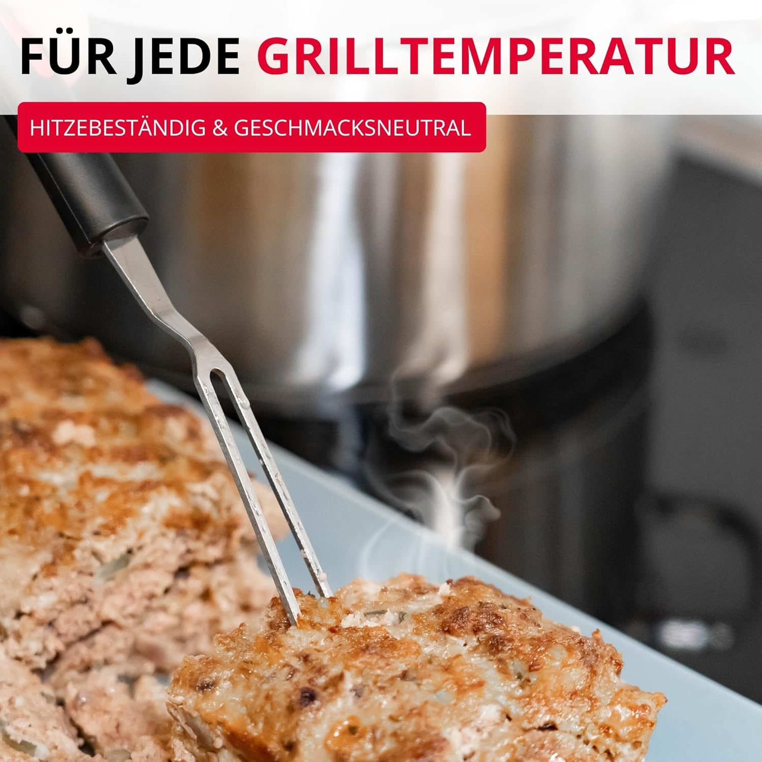 • Глава на вилицата с два здрави зъба с шипове за здраво захващане на месото, без изгаряне на пръстите благодарение на дългата дръжка, безвкусна и устойчива на петна