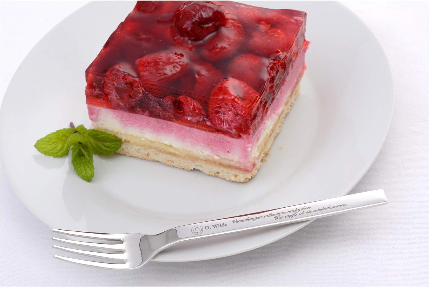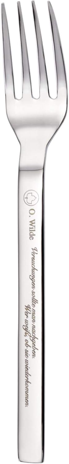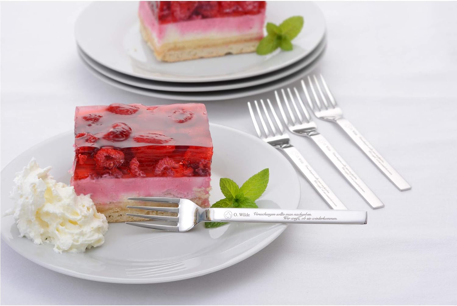 Тези вилици за торта от серията POESIE са с гравиран надпис „Човек трябва да се поддава на изкушенията. Кой знае дали ще дойдат отново?“