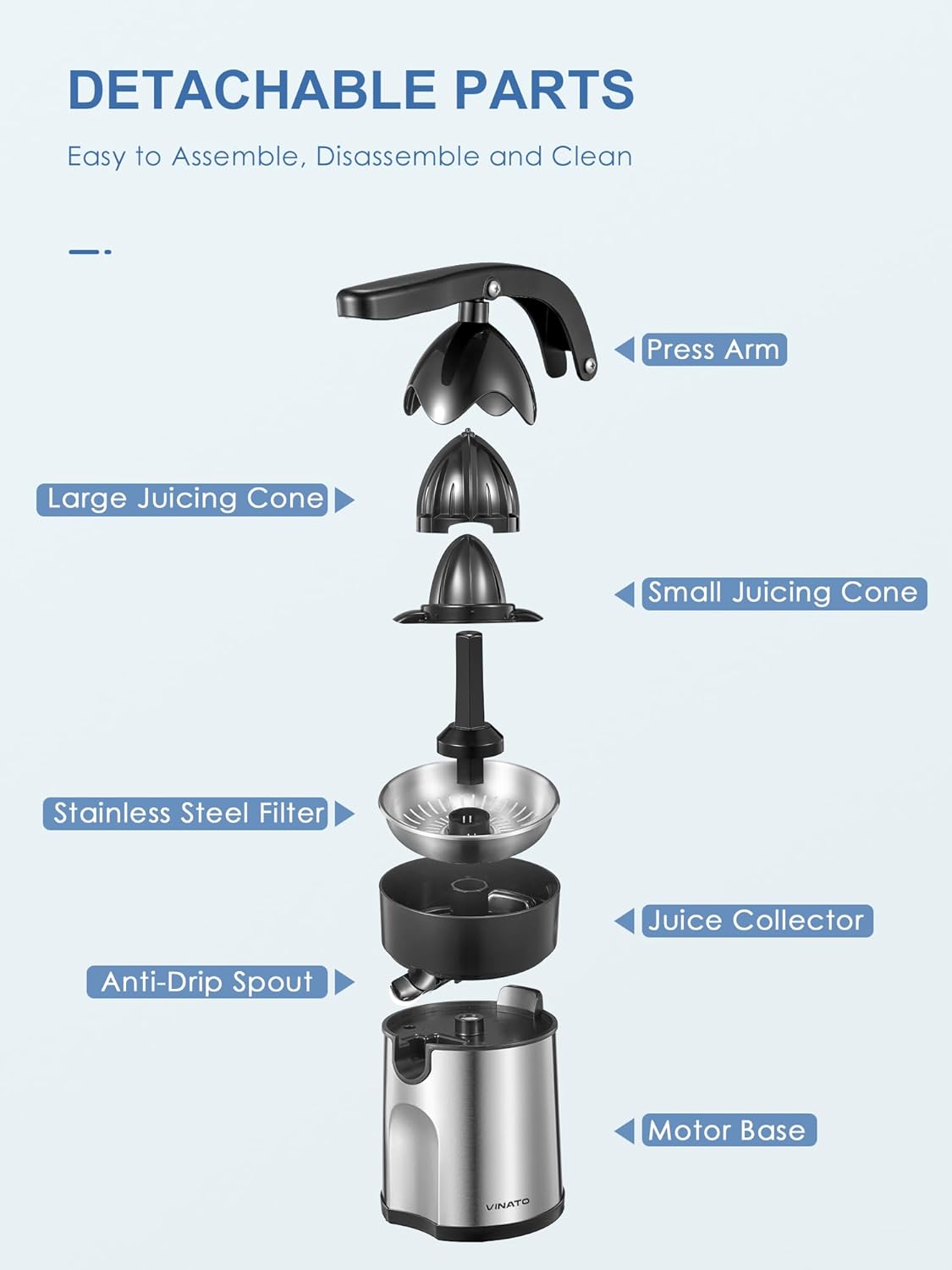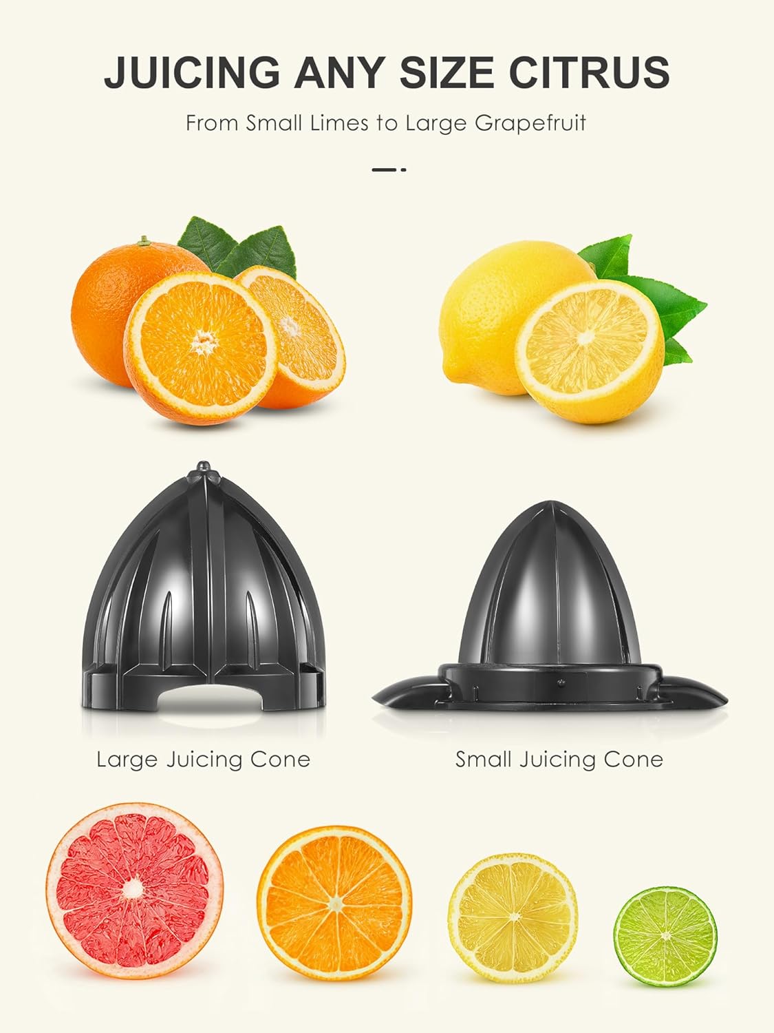 • 2 КОНА ЗА ПРИТИСВАНЕ Компактният дизайн на сокоизстисквачката заема малко място, а висококачественият корпус от неръждаема стомана прави електрическата сокоизстисквачка за цитруси от неръждаема стомана изключително здрава и издръжлива. Благодарение на 2-та включени конуса за притискане, сокоизстисквачката за цитруси може да изцежда цитрусови плодове с всякакви размери.