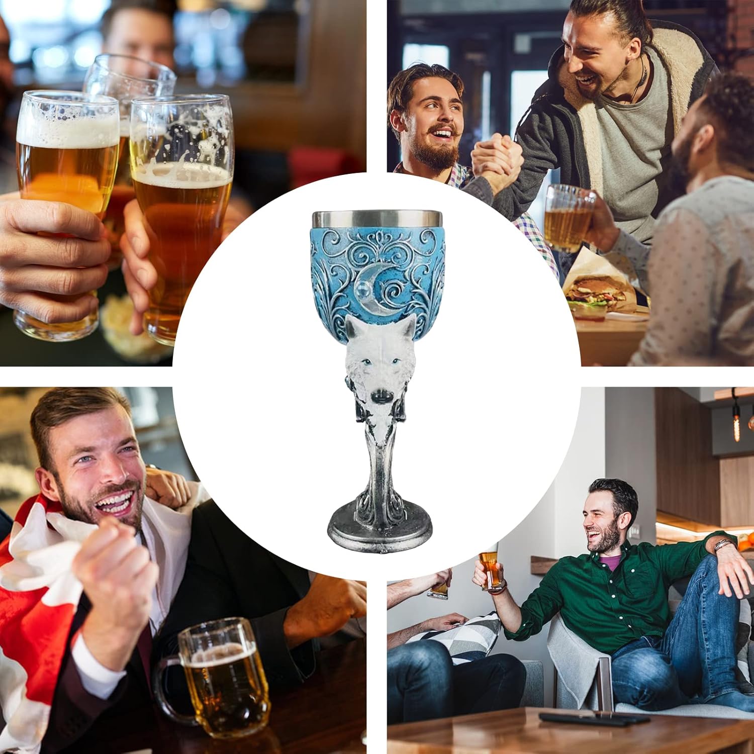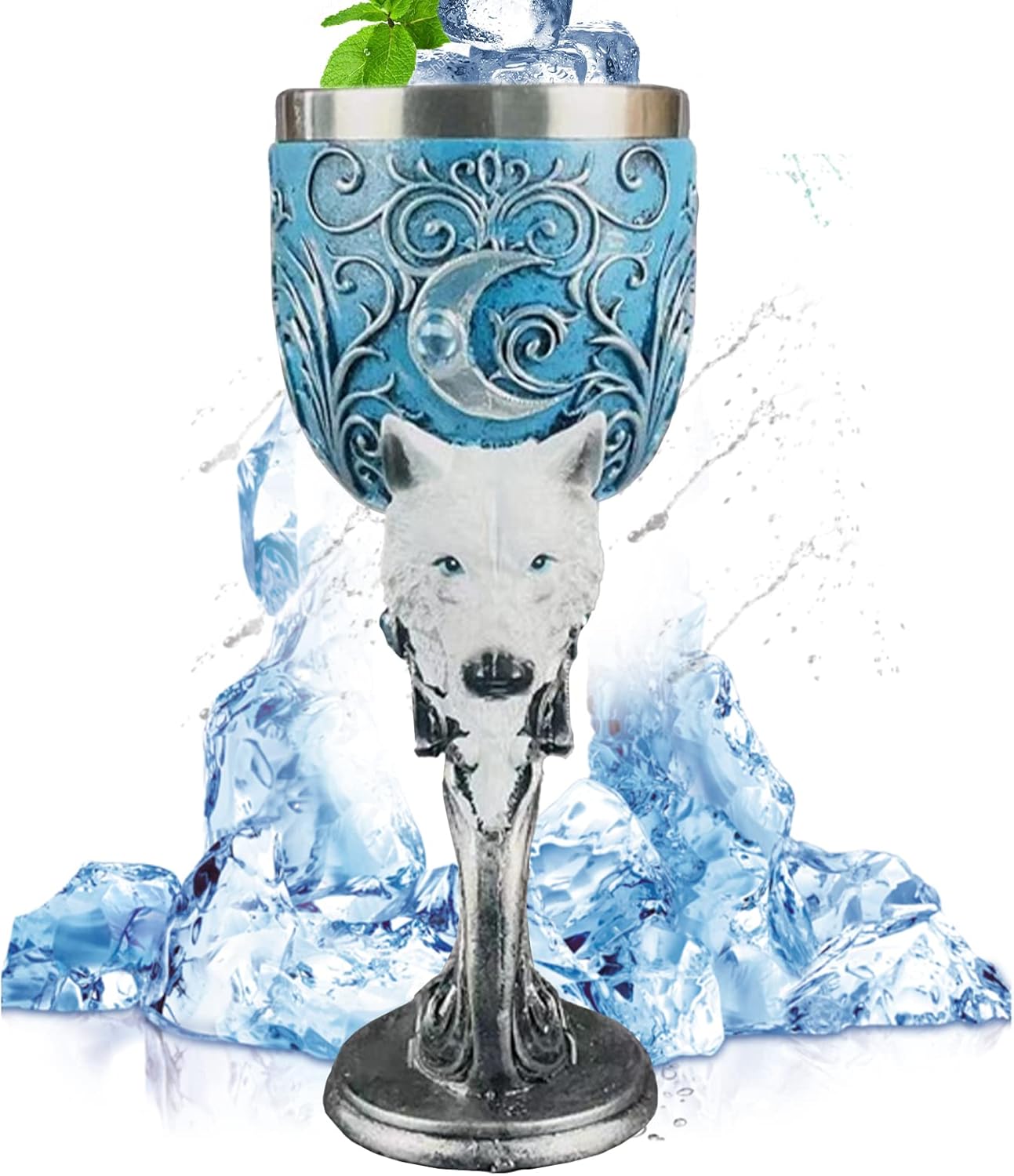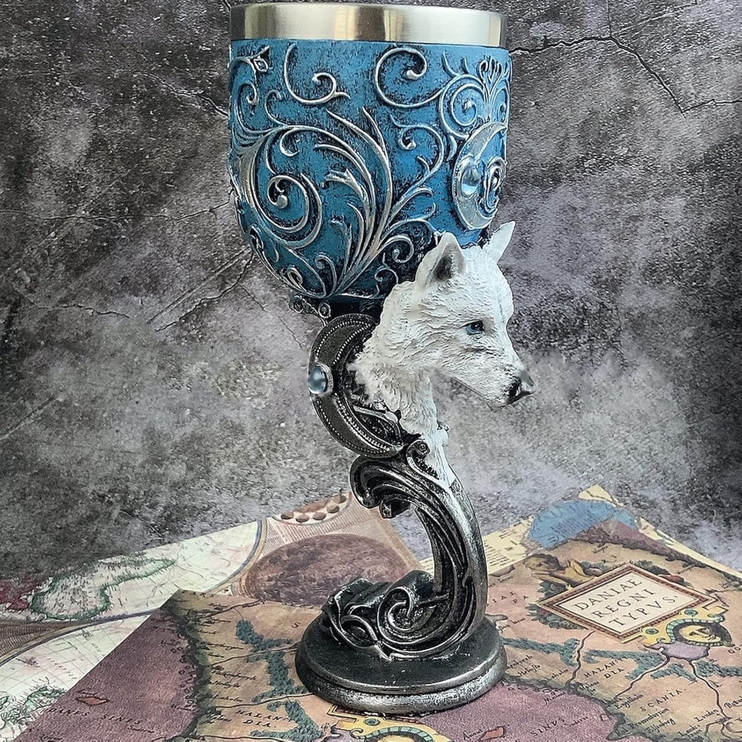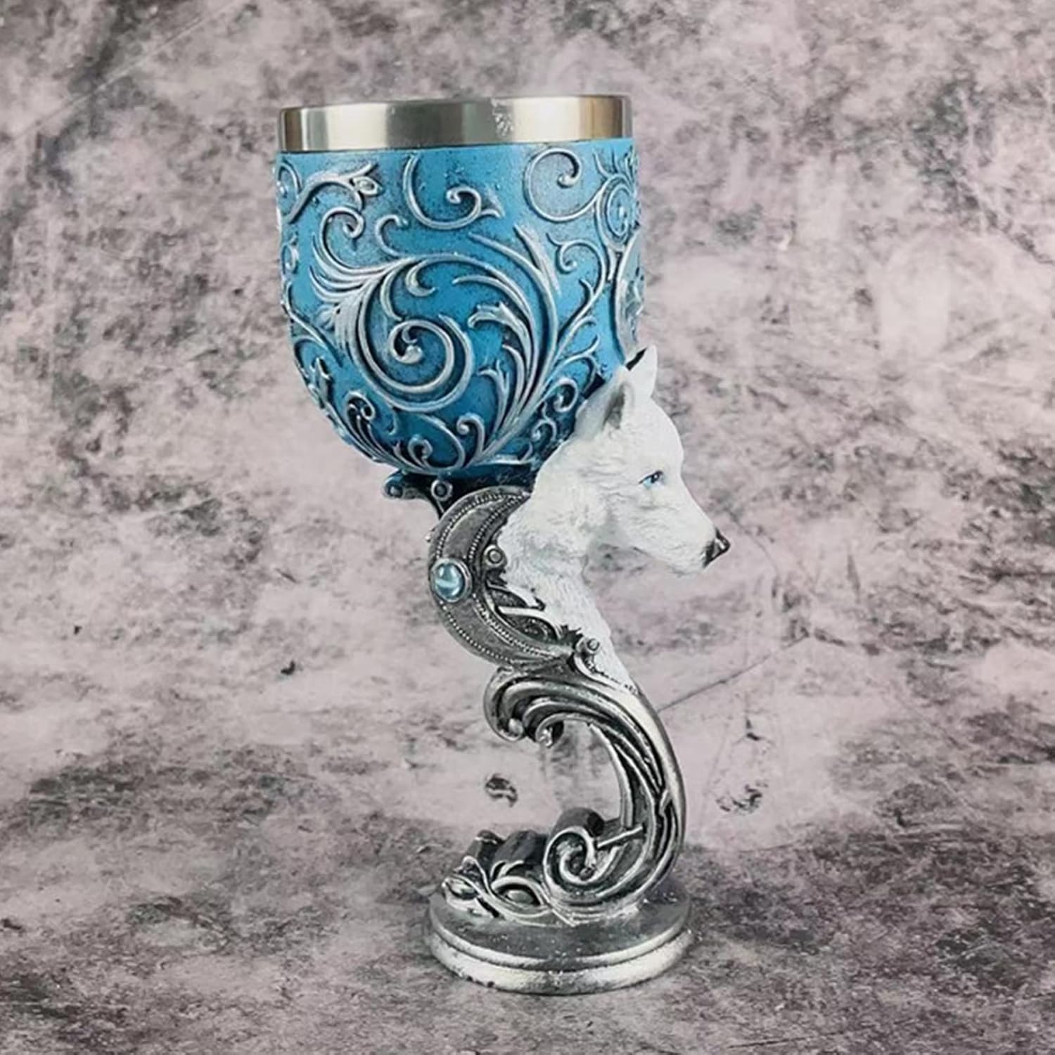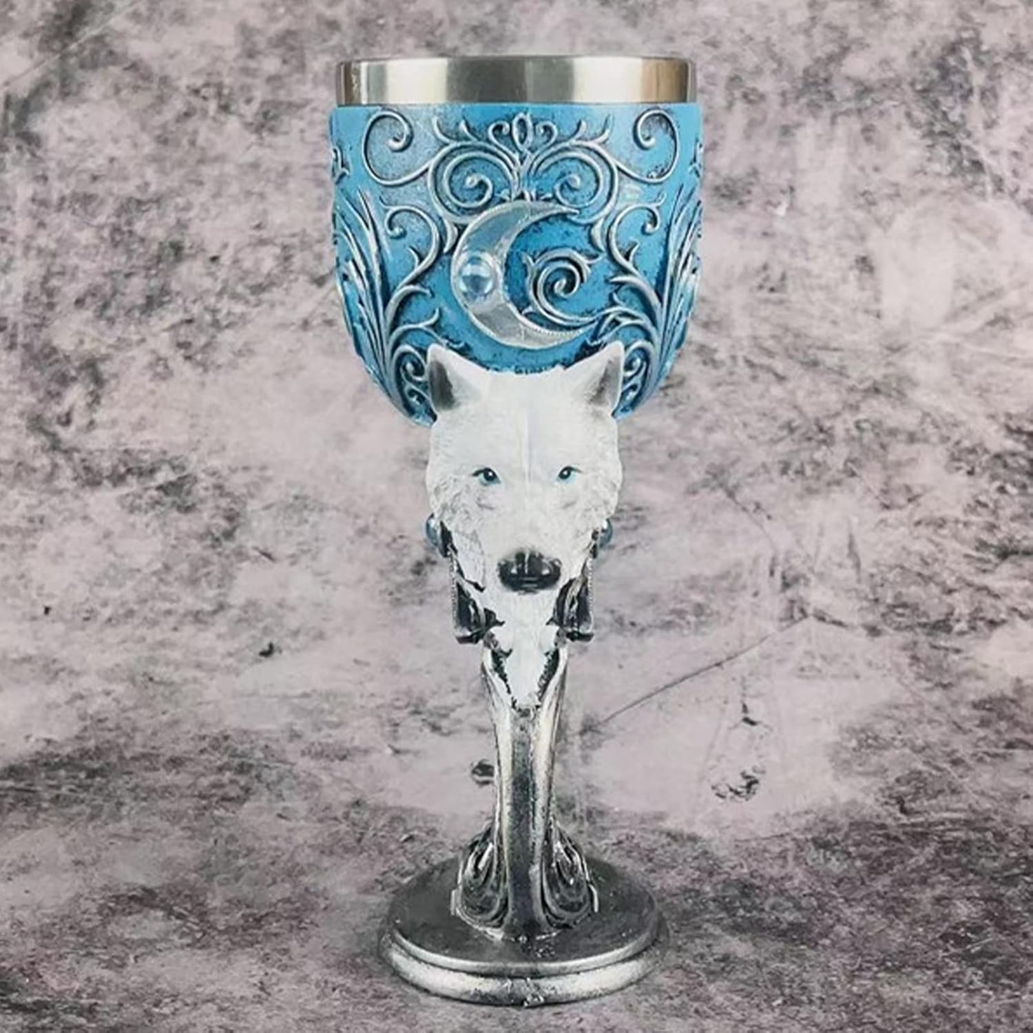 Dieser Kelch ist mit einem kunstvollen Muster aus Monden verziert, die über den gesamten Kelch tanzen. In der Mitte des Kelches erhebt sich ein lebensechter 3D-Relief eines majestätischen Wolfkopfes. Das Zusammenspiel von Mondmotiven und dem realistischen Wolfkopf verleiht dem Kelch eine mystische Atmosphäre, die die Schönheit der Nacht und die Wildheit des Wolfs einfängt. Ideal für Liebhaber von Naturmotiven und Anhänger der Mystik.