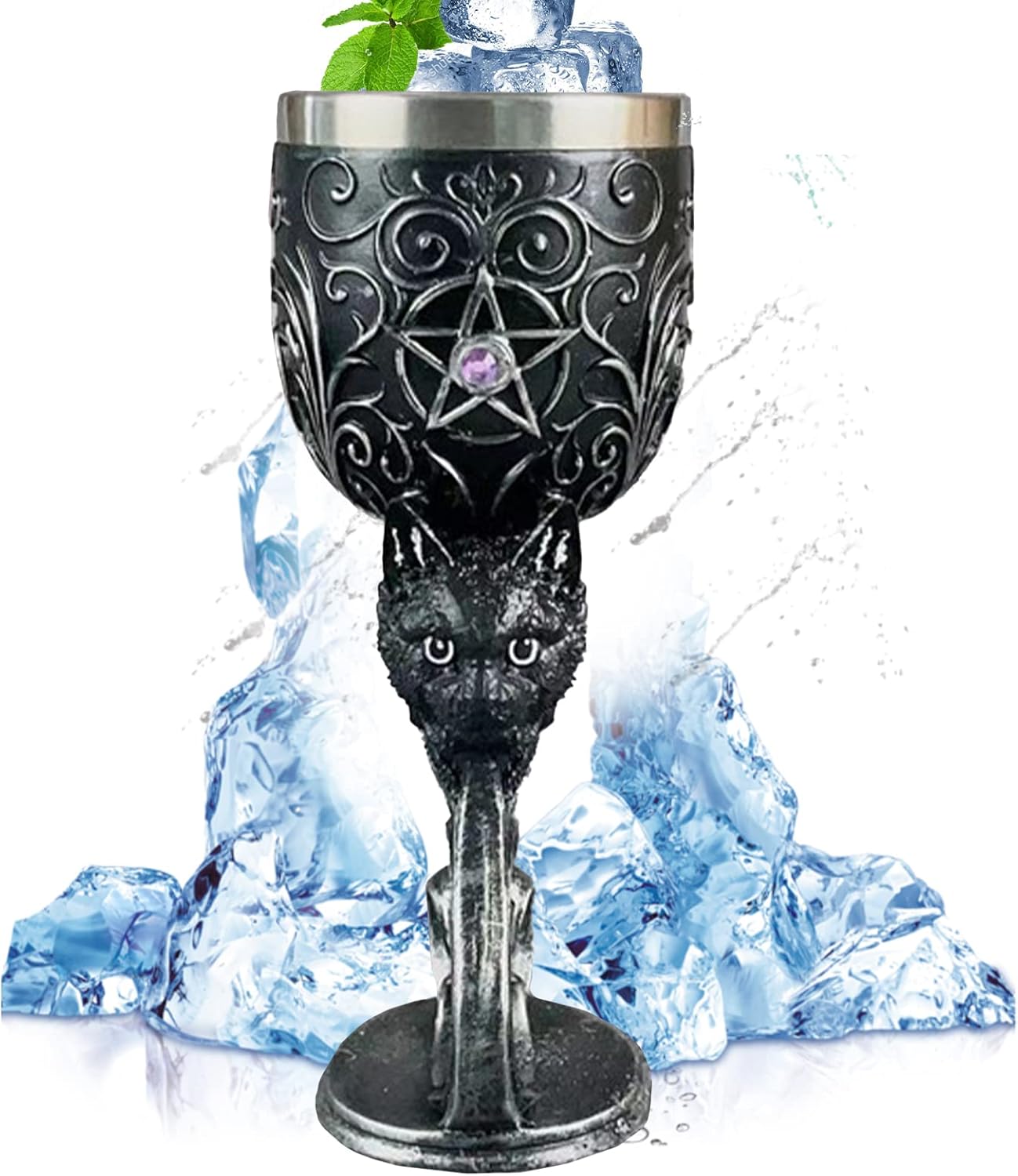 Dieser Kelch präsentiert eine geheimnisvolle schwarze Katze mit leuchtenden Augen, deren realistischer 3D-Reliefkopf den Kelch ziert. Auf dem Kelch ist eine kunstvolle Verzierung aus einer Fünf-Sterne-Stern-Symbolik zu sehen, die durch lila Edelsteine hervorgehoben wird. Die Kombination aus der geheimnisvollen Katze und den magischen Symbolen verleiht dem Kelch eine Aura der Mystik und des Übernatürlichen, die perfekt für Liebhaber des Okkulten und der schwarzen Magie ist. Ideal für Halloween-Partys und Geheimnisliebhaber.