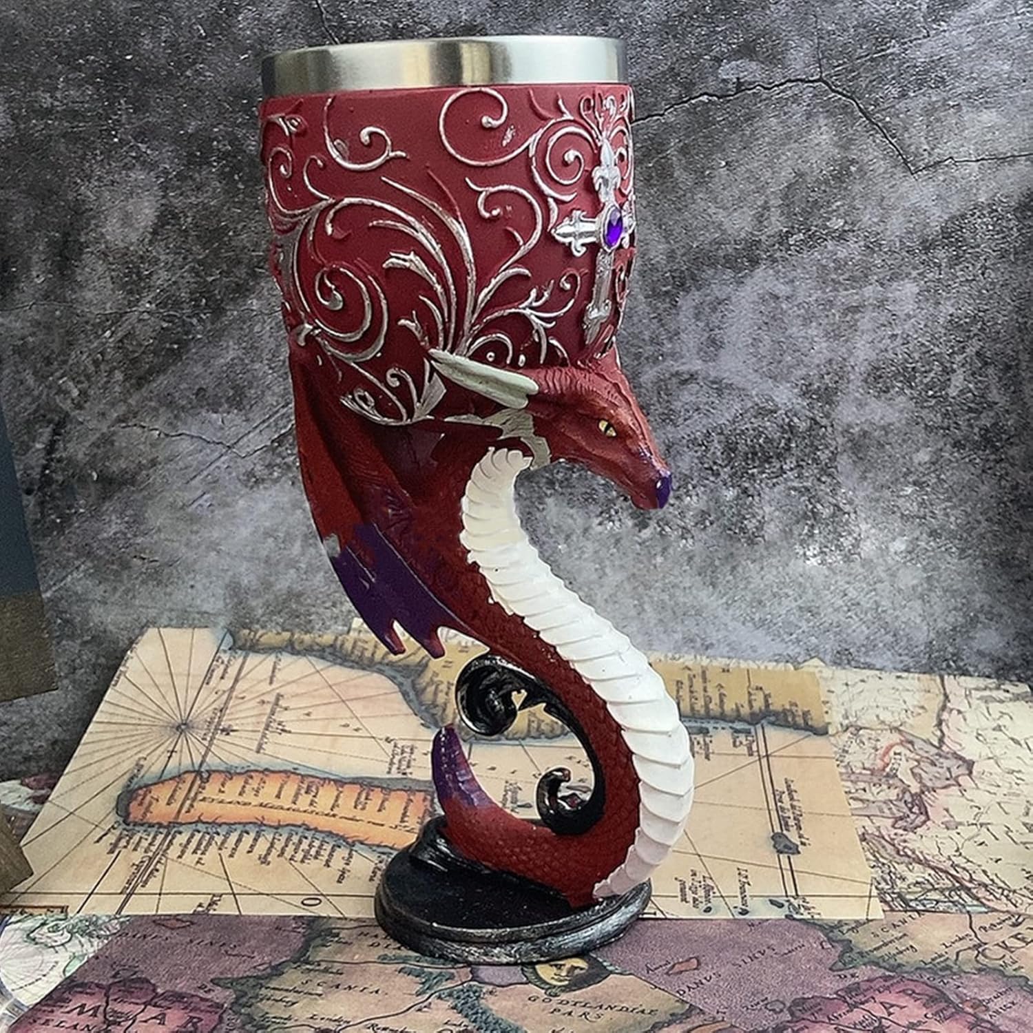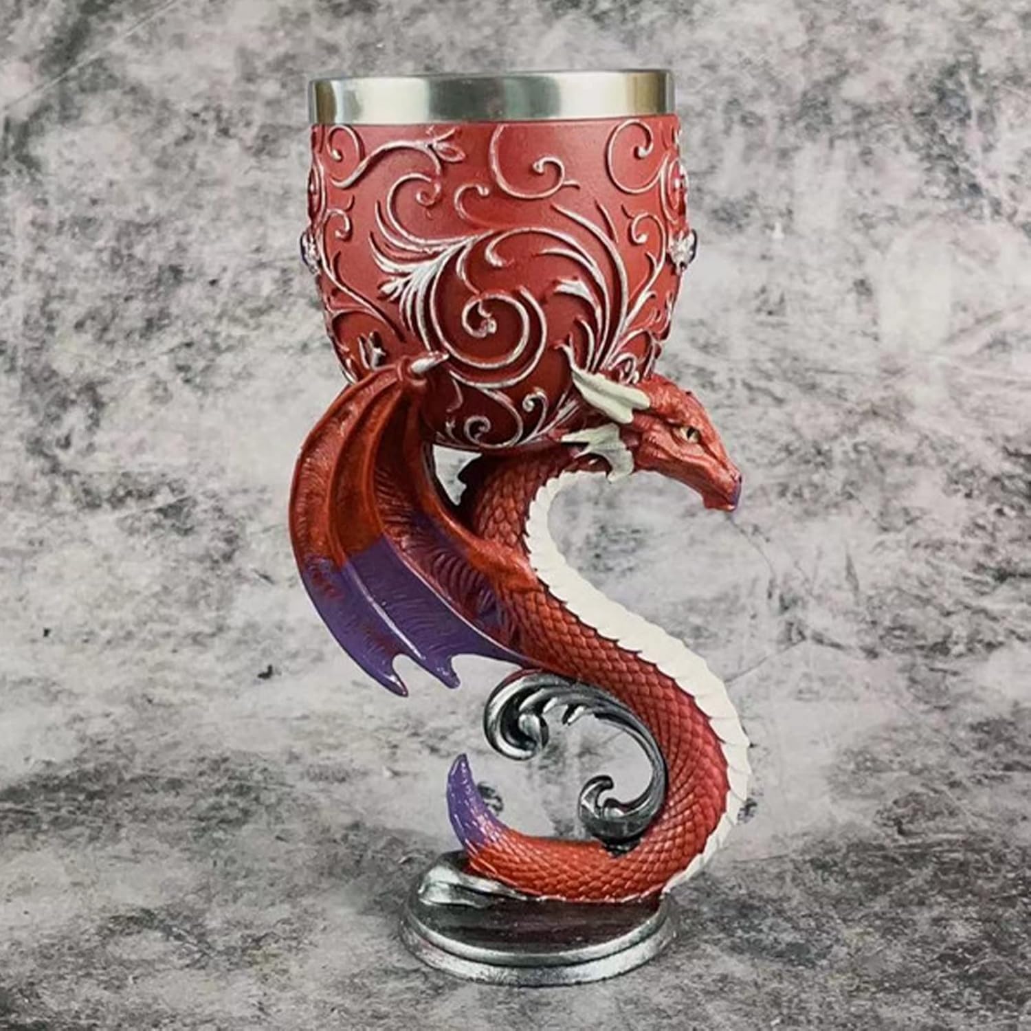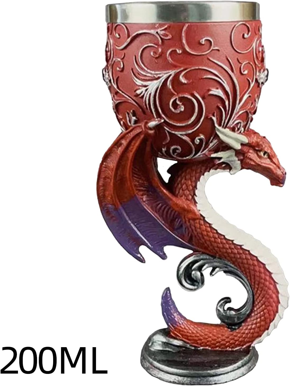 Dieser Kelch ist von Kopf bis Fuß mit einem atemberaubenden 3D-Relief eines majestätischen roten Drachens verziert. Der Drache windet sich elegant um den Kelch, seine Schuppen schimmern im Licht und seine Flügel erstrecken sich majestätisch. Die kunstvolle Darstellung verleiht dem Kelch eine kraftvolle und eindringliche Präsenz, die die Fantasie beflügelt und jeden Raum mit einer Aura des Abenteuers erfüllt. Ideal für Liebhaber von Drachenmythen und Fans von epischen Geschichten.