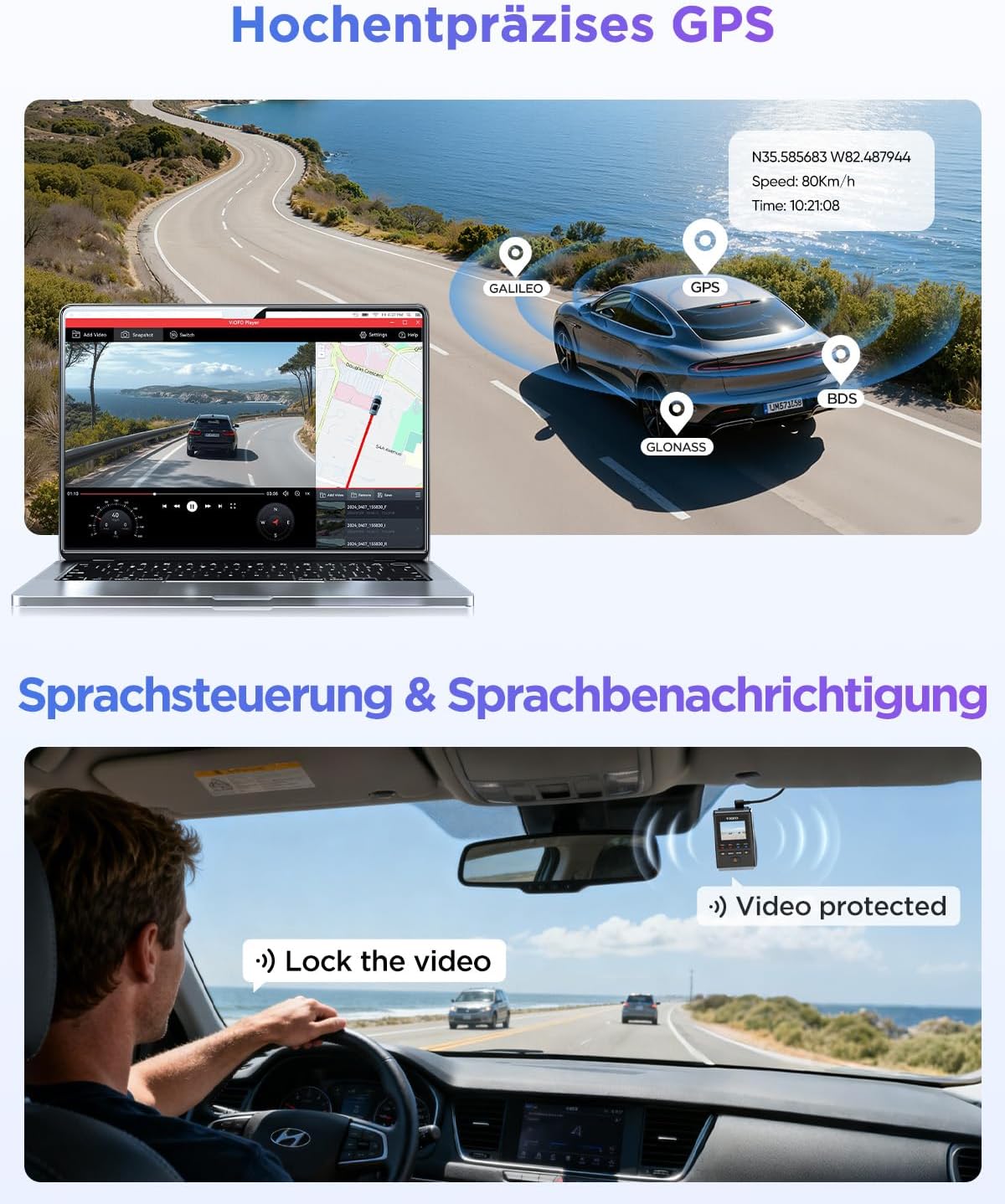 • [Wi-Fi 6 от следващо поколение и GPS с четири режима] A119M Pro предлага усъвършенствана Wi-Fi 6 свързаност за ултрабърз трансфер на файлове до 30 MB/s, безпроблемен преглед на видео, изтегляния и споделяне чрез приложението VIOFO (iOS/Android). Вграденият GPS с четири режима предоставя точни данни за местоположение, скорост и времеви отпечатък за всяко пътуване, предоставяйки надеждни доказателства, когато имате най-голяма нужда от тях.