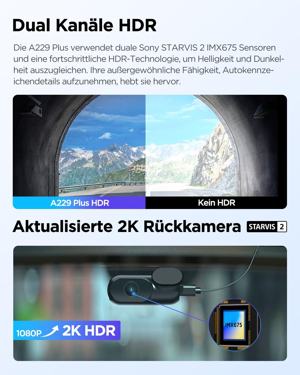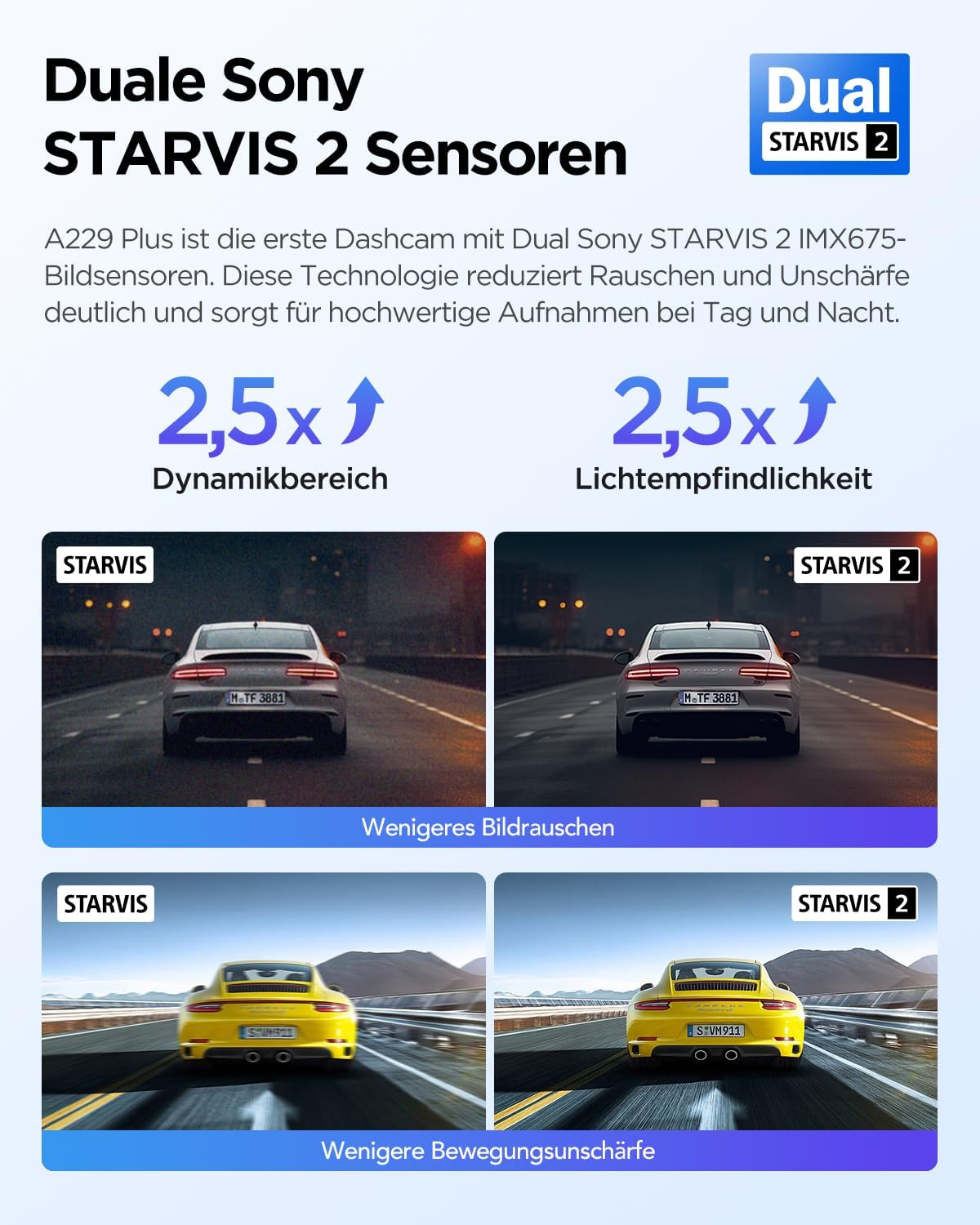 • 【2K+2K с двоен сензор STARVIS 2】A229 Plus е оборудван с най-съвременна технология за двойна камера STARVIS 2. Сензорите за изображения STARVIS 2 позволяват кристално чист 2K+2K запис както за предната, така и за задната част на видеорегистратора. С 2,5 пъти по-голям динамичен диапазон и по-висока светлочувствителност в сравнение с първото поколение STARVIS, шумът и размазването от движение са значително намалени денем и нощем. Това води до брилянтни видеозаписи с невероятни детайли.