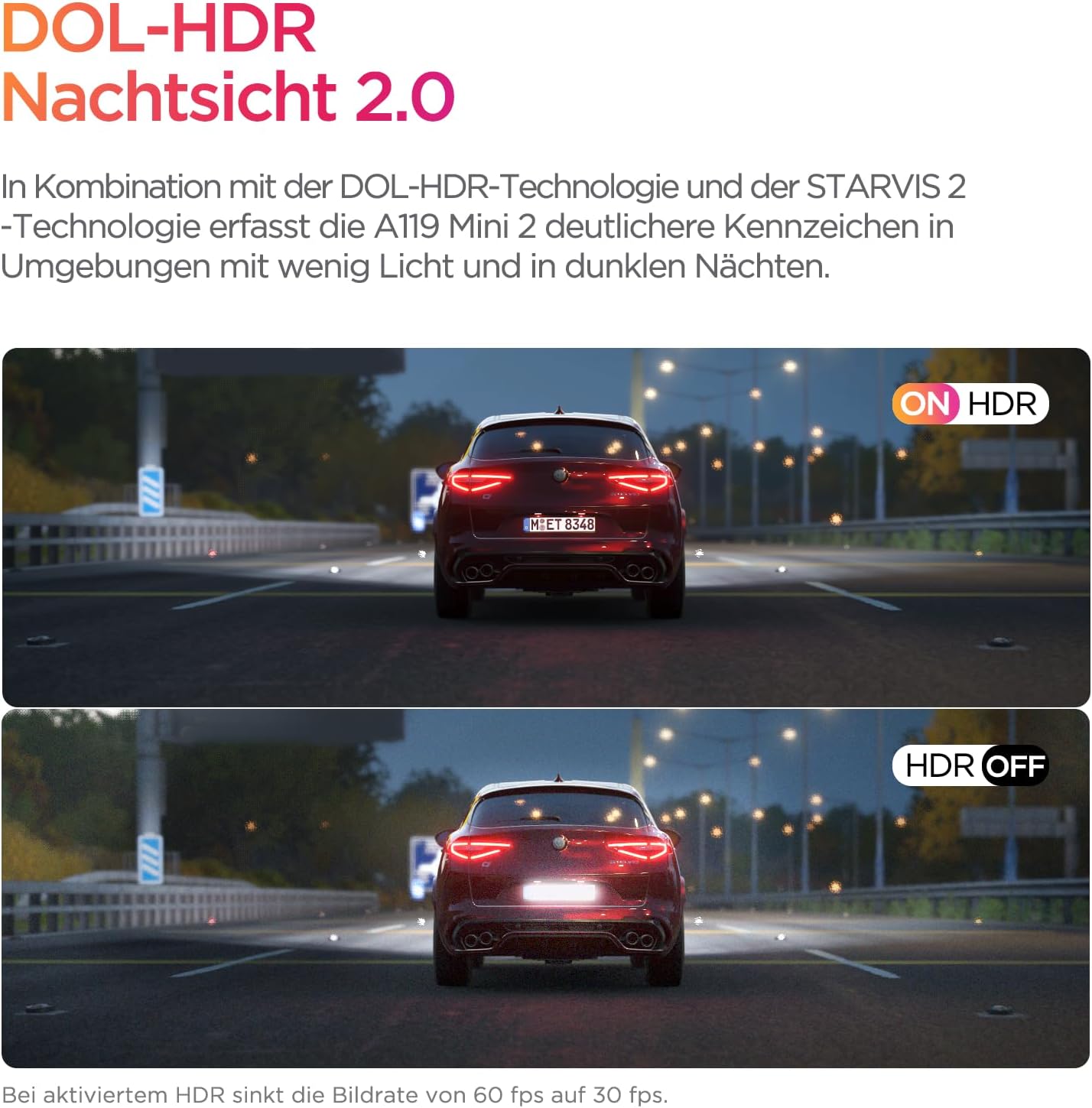• 【2.7K + DOL HDR запис】Предната видеокамера за автомобил „A119 mini 2“ записва в 2.7K, предлагайки изображения с кинематографично качество, несравними досега с конкурентите. Този 2K запис гарантира, че вашата видеокамера лесно ще заснеме важни детайли и фини аспекти, като пътни знаци и регистрационни номера, от решаващо значение за застрахователни искове или при изпращане на доказателства в полицията. (Моля, деактивирайте HDR, преди да използвате 60 кадъра в секунда)