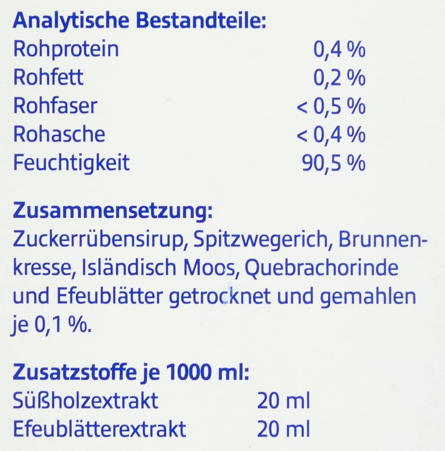 Сироп от захарно цвекло, теснолист живовляк, кресон, исландски мъх, кора от кебрахо и листа от бръшлян, изсушени и смлени, всяко по 0,1%.