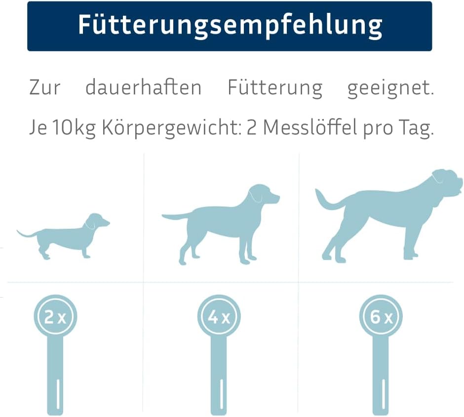 Die tägliche Dosierung richtet sich nach dem Körpergewicht Ihres Hundes: Je 10 kg Körpergewicht = 2 Messlöffel pro Tag (1 gestrichener Messlöffel = 1 g). Bei der Fütterung mit Trockenfutter empfehlen wir, etwas warmes Wasser hinzuzugeben, damit das Pulver besser haftet. Bitte stellen Sie stets frisches Trinkwasser bereit.