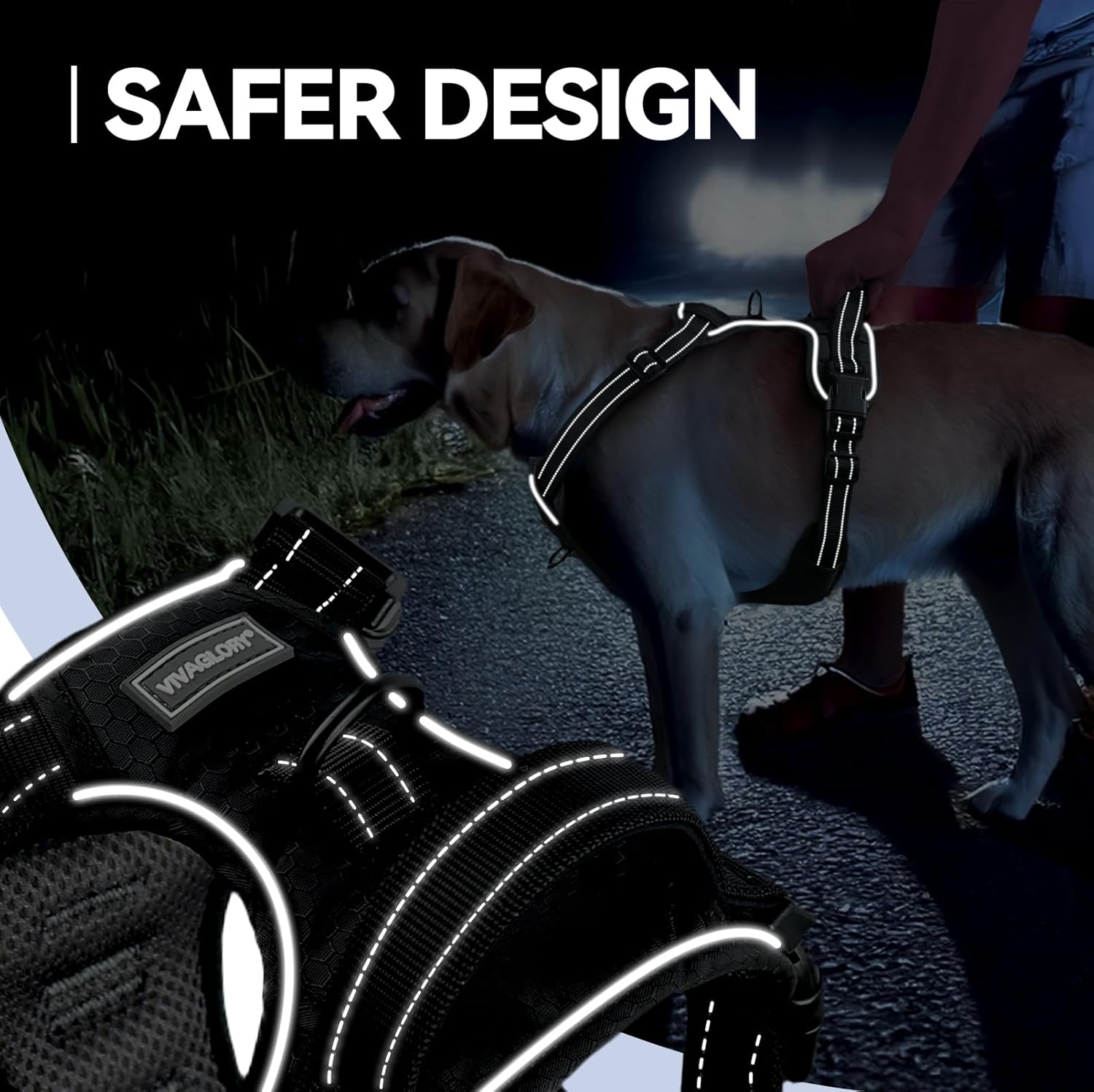 • Против дърпане: Кучешкият нагръдник VIVAGLORY против дърпане е оборудван с два здрави метални D-образни пръстена за ефективно намаляване на дърпането и подобряване на контрола. Предният D-образен пръстен помага за пренасочване на кучето и коригиране на поведението при дърпане – идеален за обучение. Задният D-образен пръстен е подходящ за разходки, джогинг или туризъм. Дизайнът разпределя равномерно силата на опън, не е задушаващ и предпазва врата на кучето. Подсилените шевове увеличават издръжливостта.
