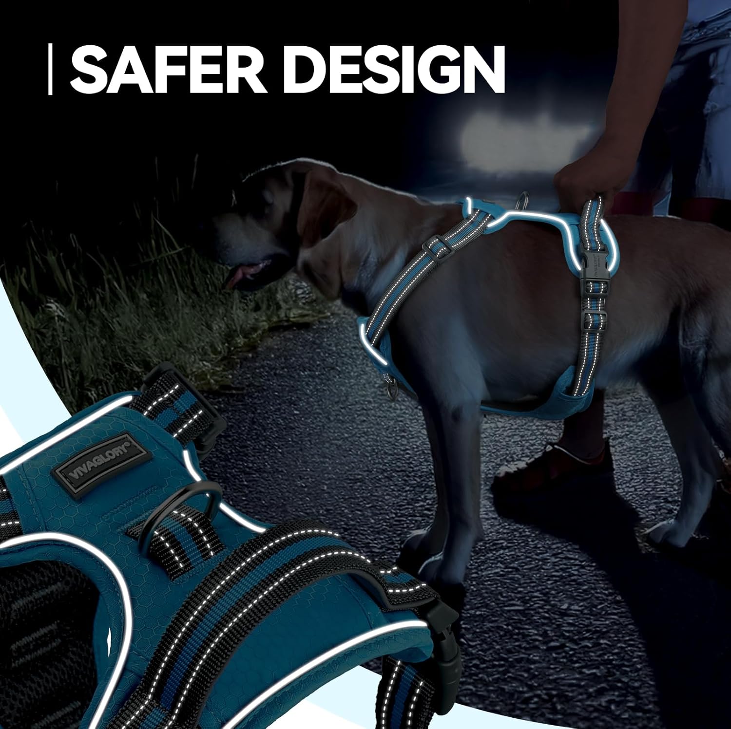 • Против дърпане: Кучешкият нагръдник VIVAGLORY против дърпане е оборудван с два здрави метални D-образни пръстена за ефективно намаляване на дърпането и подобряване на контрола. Предният D-образен пръстен помага за пренасочване на кучето и коригиране на поведението при дърпане – идеален за обучение. Задният D-образен пръстен е подходящ за разходки, джогинг или туризъм. Дизайнът разпределя равномерно силата на опън, не е задушаващ и предпазва врата на кучето. Подсилените шевове увеличават издръжливостта.