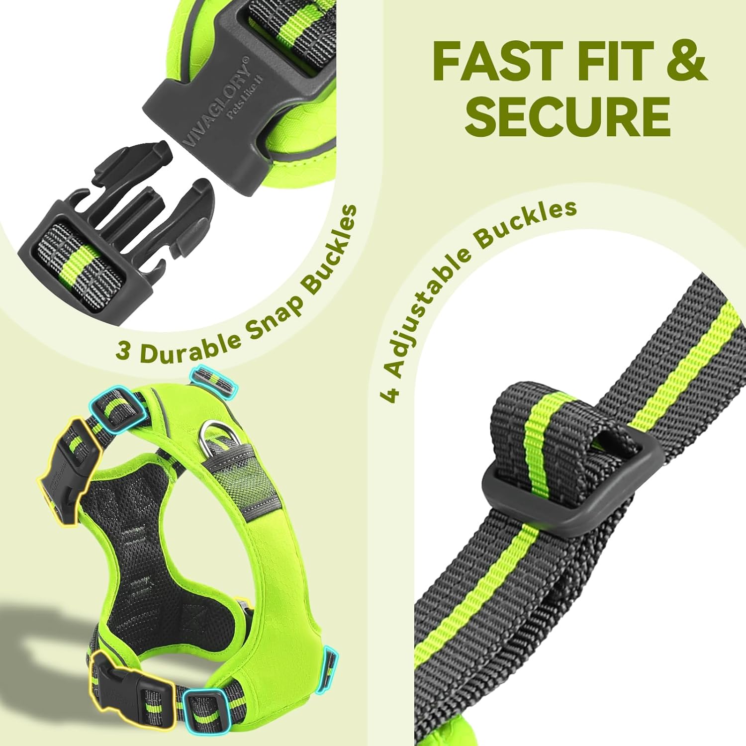 • Против дърпане: Кучешкият нагръдник VIVAGLORY против дърпане е оборудван с два здрави метални D-образни пръстена за ефективно намаляване на дърпането и подобряване на контрола. Предният D-образен пръстен помага за пренасочване на кучето и коригиране на поведението при дърпане – идеален за обучение. Задният D-образен пръстен е подходящ за разходки, джогинг или туризъм. Дизайнът разпределя равномерно силата на опън, не е задушаващ и предпазва врата на кучето. Подсилените шевове увеличават издръжливостта.