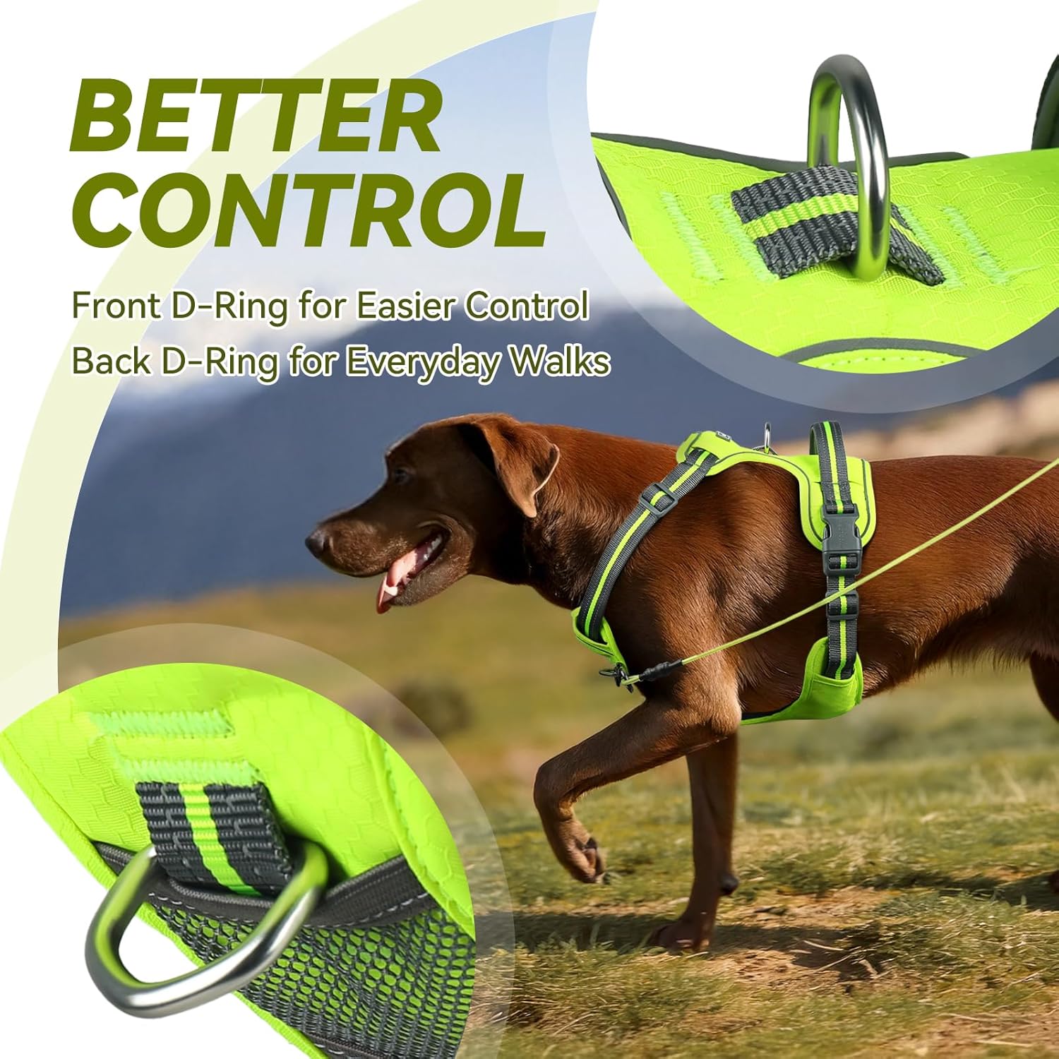 • Против дърпане: Кучешкият нагръдник VIVAGLORY против дърпане е оборудван с два здрави метални D-образни пръстена за ефективно намаляване на дърпането и подобряване на контрола. Предният D-образен пръстен помага за пренасочване на кучето и коригиране на поведението при дърпане – идеален за обучение. Задният D-образен пръстен е подходящ за разходки, джогинг или туризъм. Дизайнът разпределя равномерно силата на опън, не е задушаващ и предпазва врата на кучето. Подсилените шевове увеличават издръжливостта.