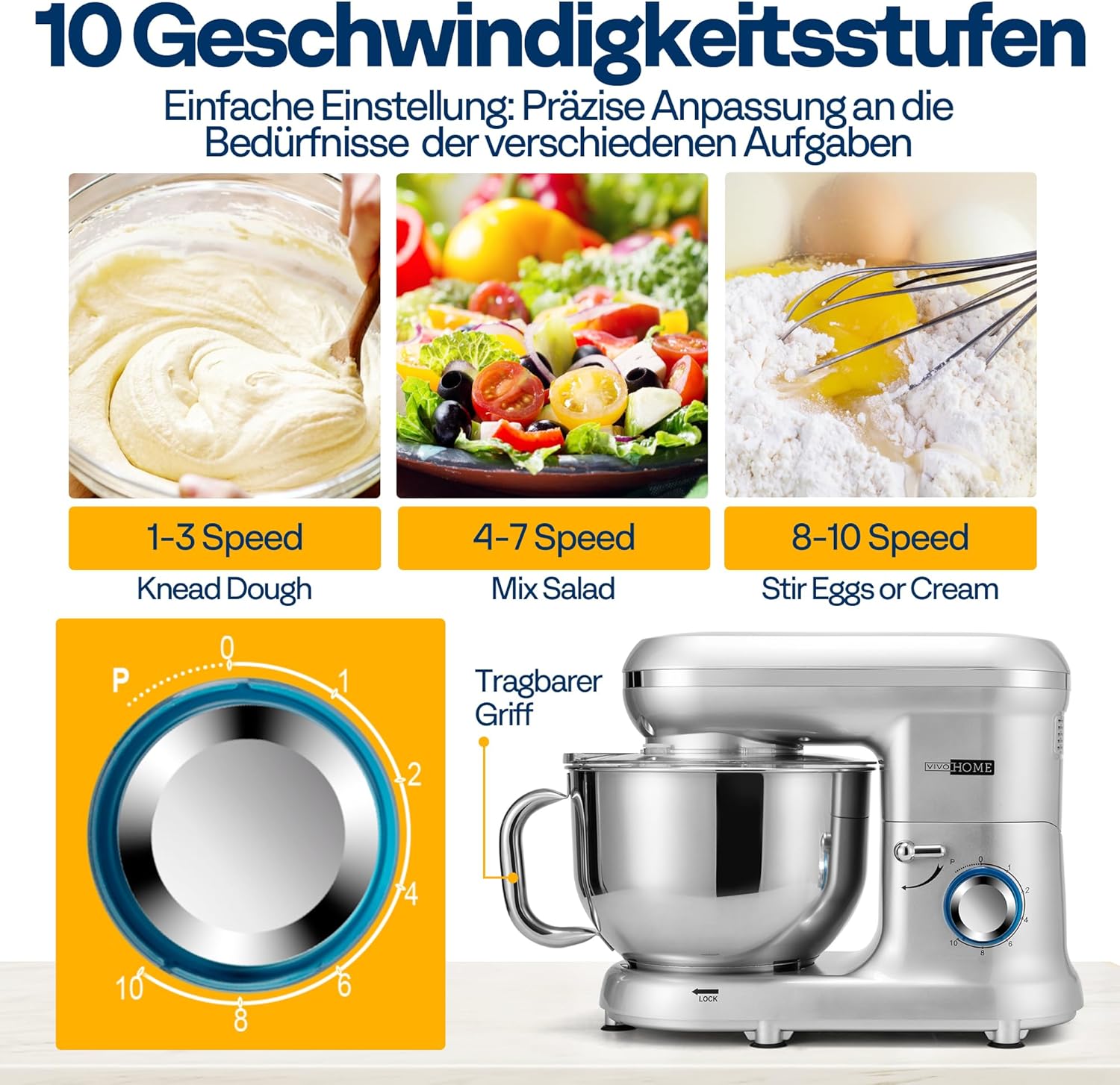 • Ефективно и интуитивно: Принципът на работа на планетарната бъркалка позволява цялостно разбъркване, спестява ви много време и е вашият надежден кухненски помощник. Прозрачният капак ви позволява визуално да следите напредъка на операцията. Можете да наливате вода, мляко или други течни съставки директно през отворите в предпазителя от пръски без прекъсване. Дизайнът с накланяща се глава улеснява поставянето и отстраняването на контейнери и аксесоари.