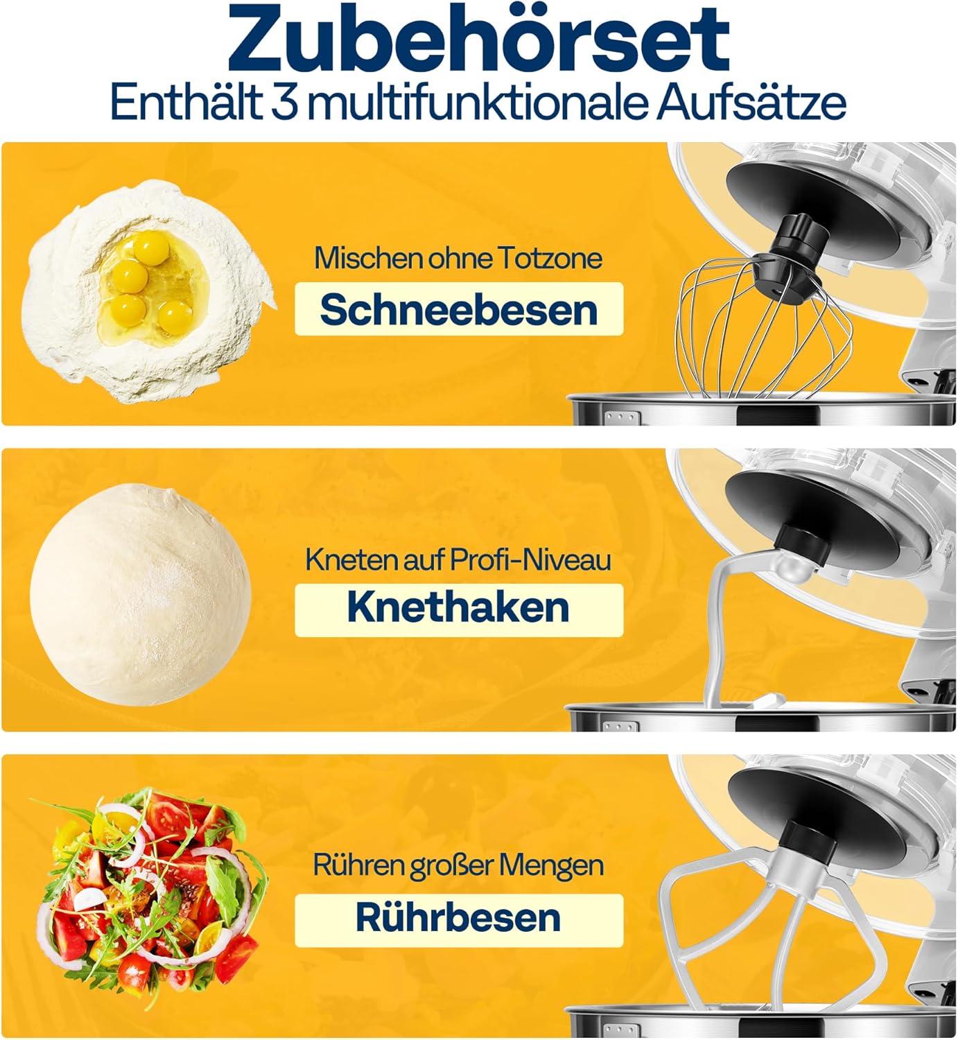 • КОМПЛЕКТ ИЗДРЪЖЛИВИ АКСЕСОАРИ Оборудван с 4 многофункционални аксесоара: тел за бъркане от неръждаема стомана, алуминиева кука за тесто, бъркалка с тефлоново покритие и сепаратор за жълтъци, за да отговори на вашите нужди при приготвяне на тесто, бисквитки, торти, мъфини, гофрети и други. Различни нужди от смесване. Забележка: аксесоарите не са подходящи за съдомиялна машина.