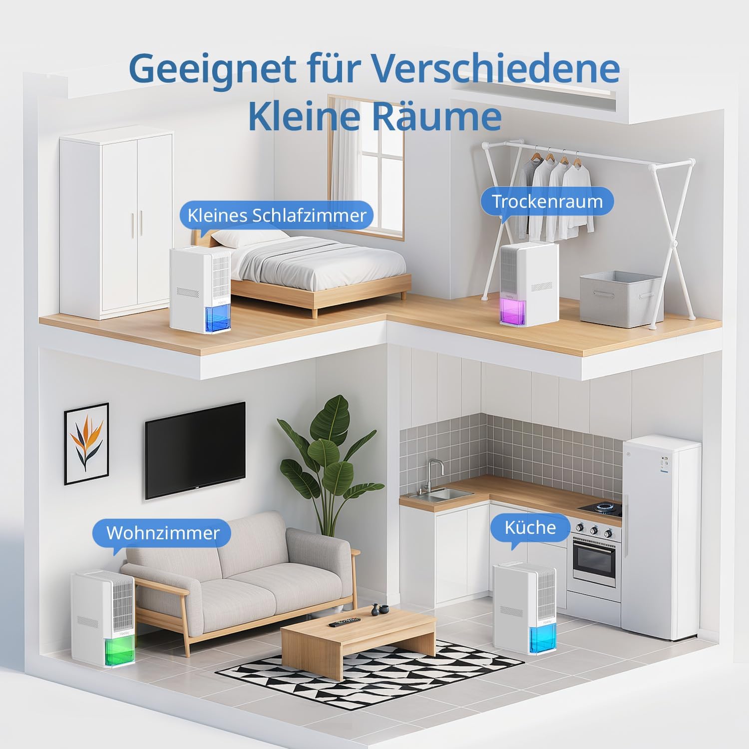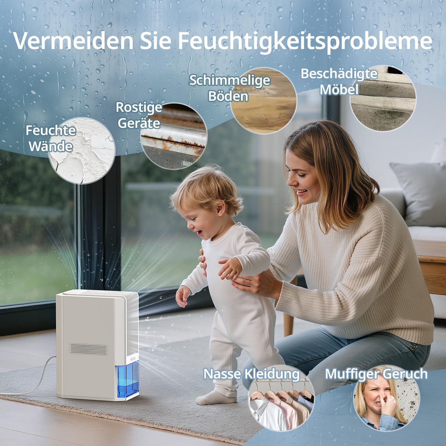 • Преносим влагоабсорбатор за всеки ъгъл: Компактният размер и преносимият дизайн на дръжката правят този влагоабсорбатор тих и гъвкав, където пожелаете. Идеален за малки помещения с висока влажност, като кухня, кемпер, малка каравана, шкаф, скрин, стена и прозорец.