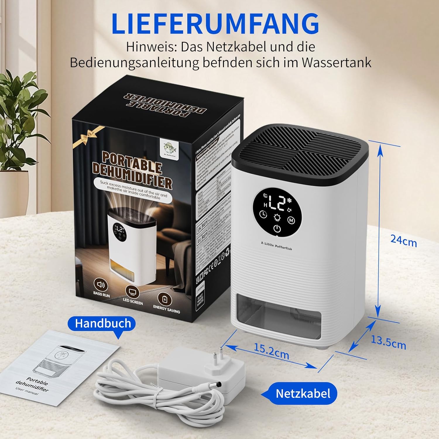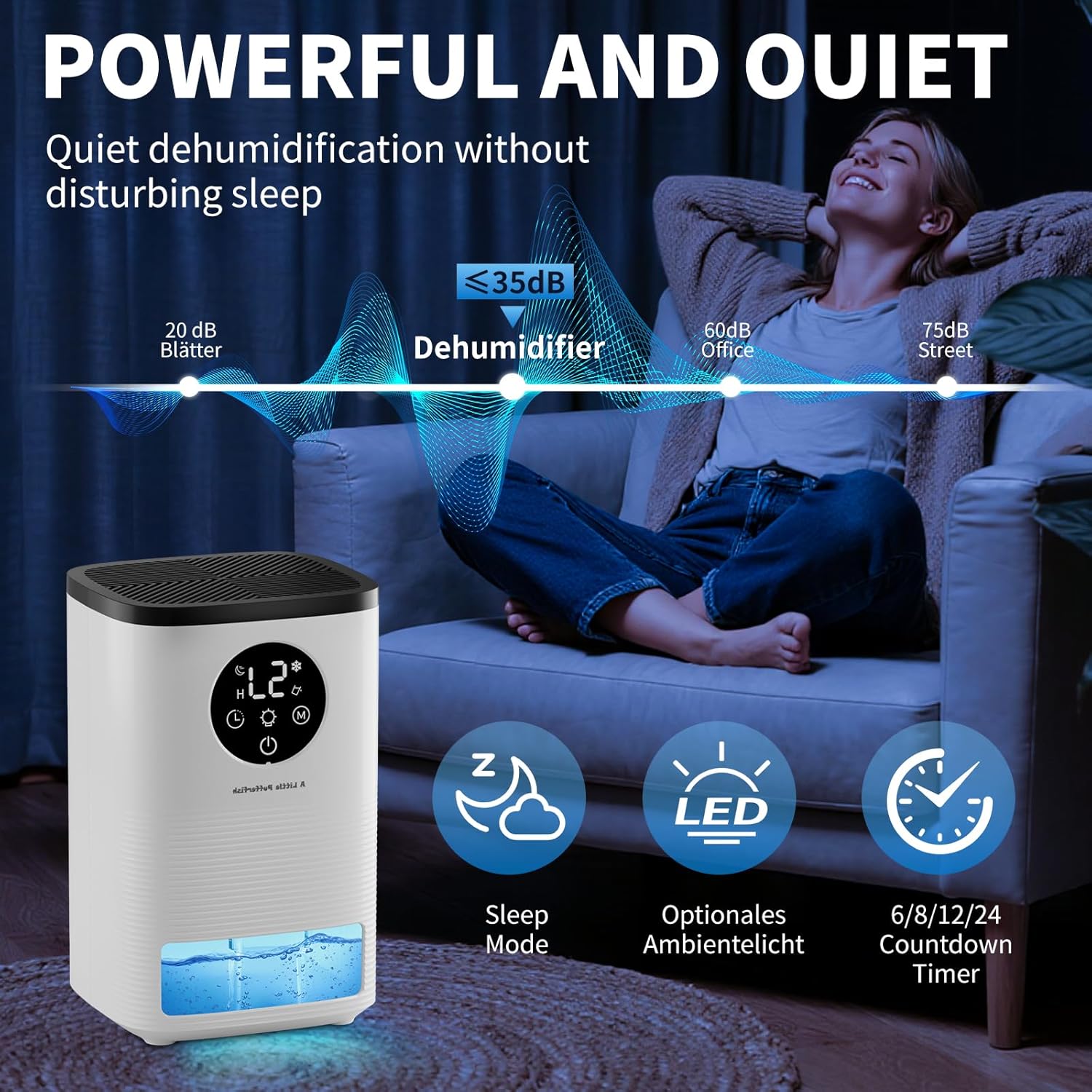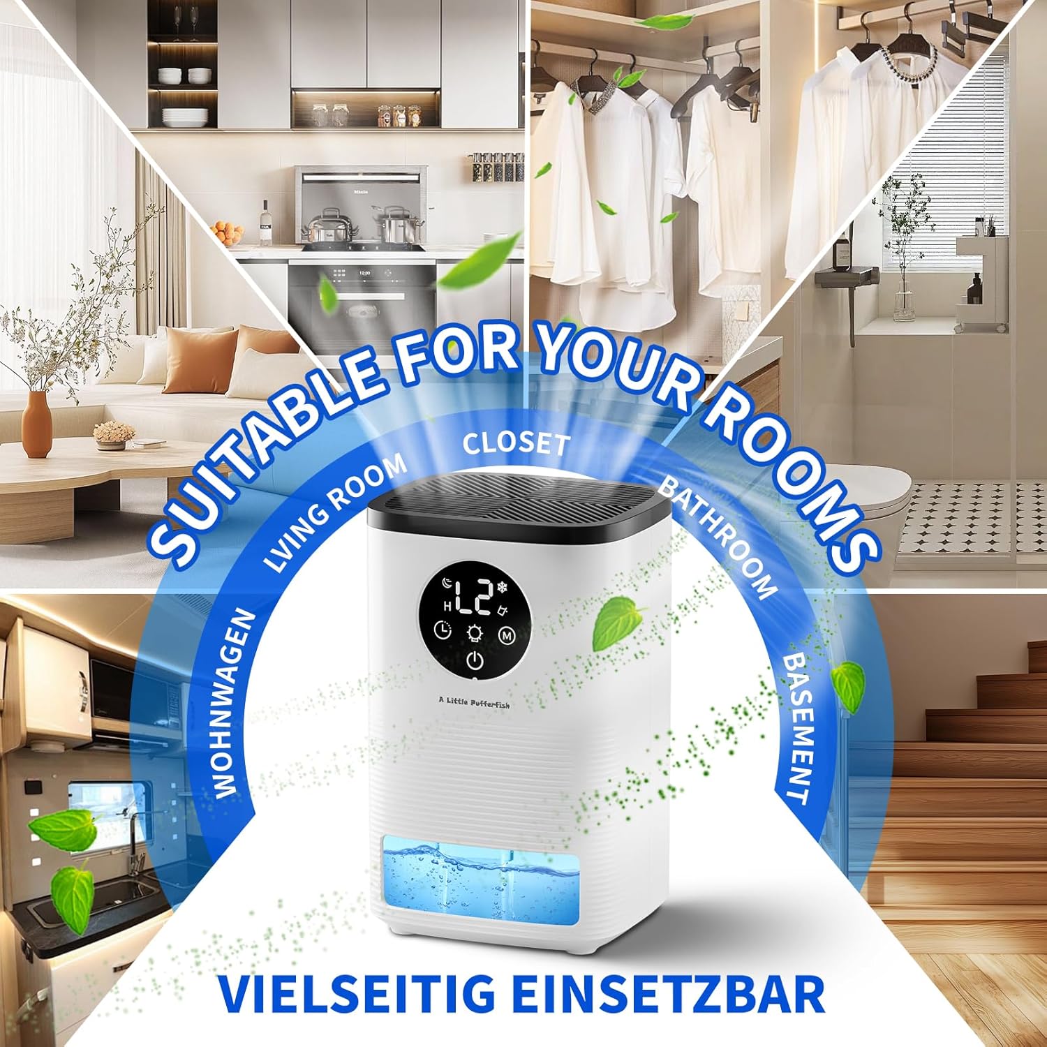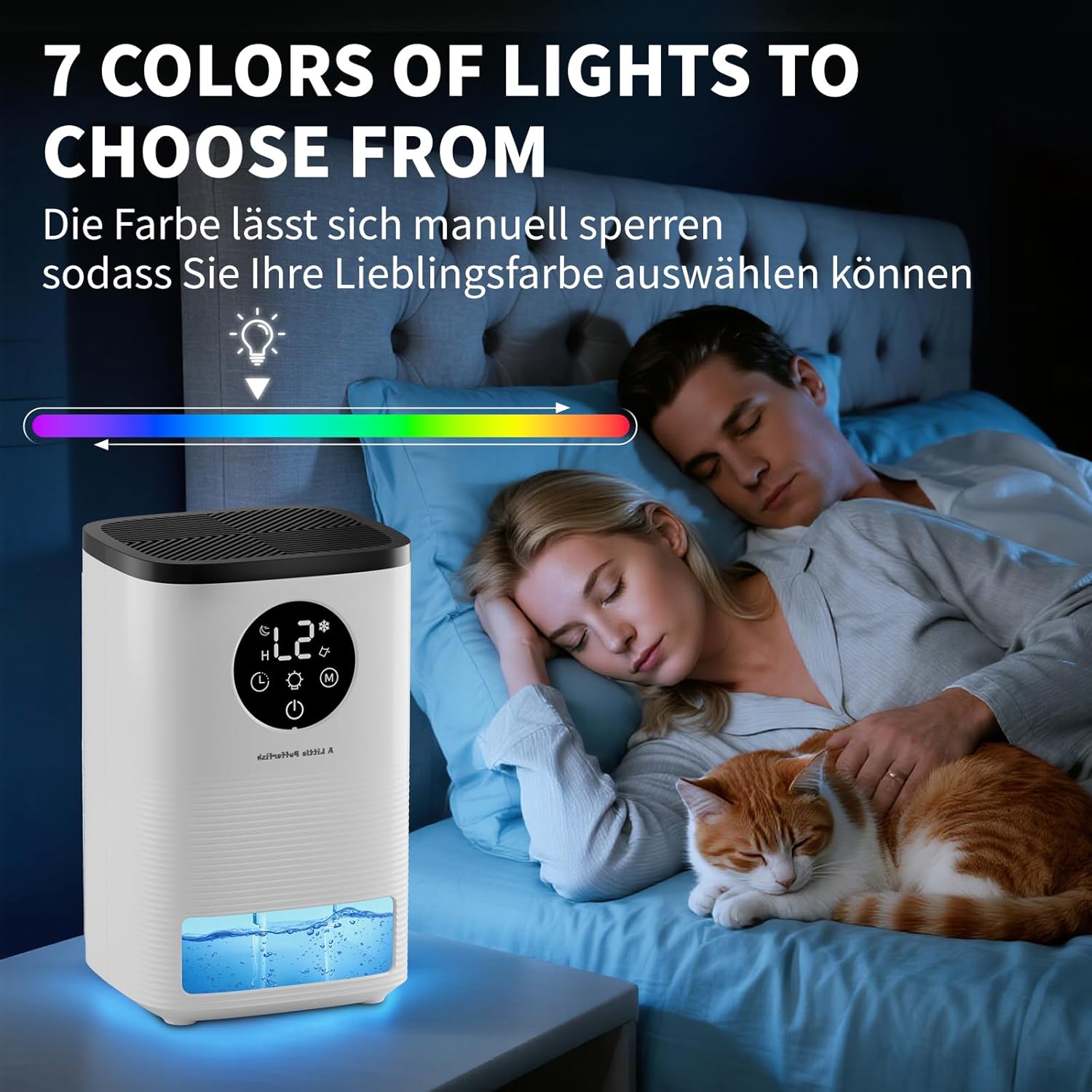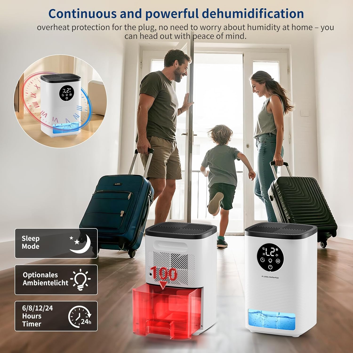 Wenn der 1600 ml fassende Wassertank seine maximale Kapazität erreicht, zeigt eine praktische Kontrollleuchte an, wenn er voll ist. Der Mini-Luftentfeuchter schaltet sich dann automatisch ab, bis der Tank geleert ist, um Energie zu sparen und Energiekosten zu reduzieren.