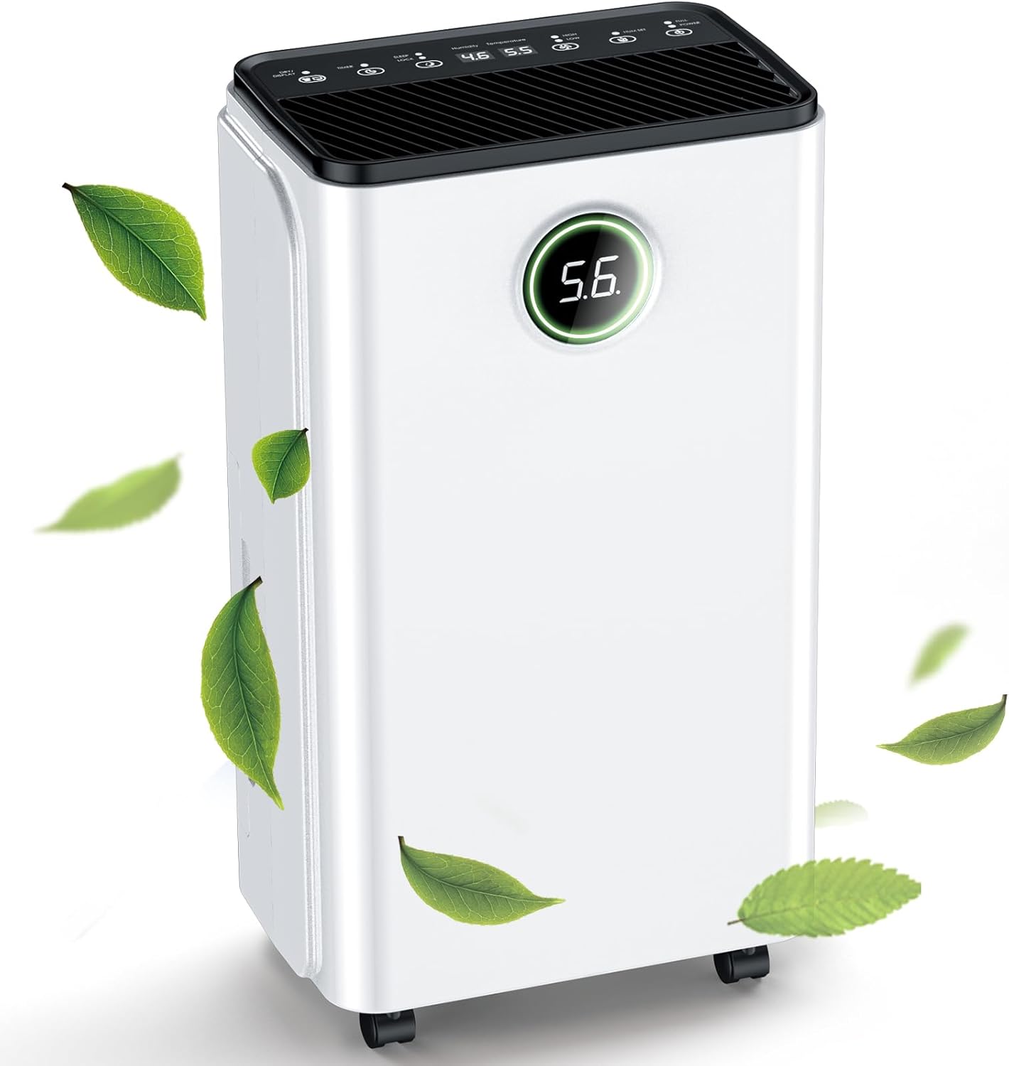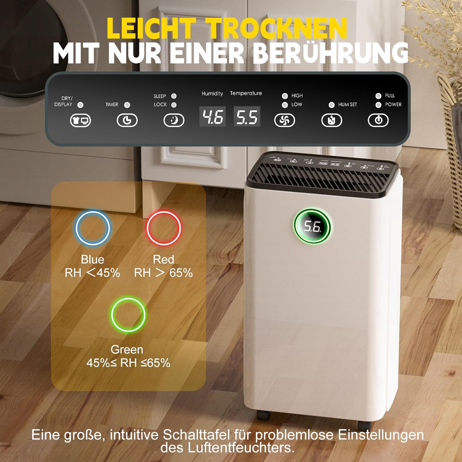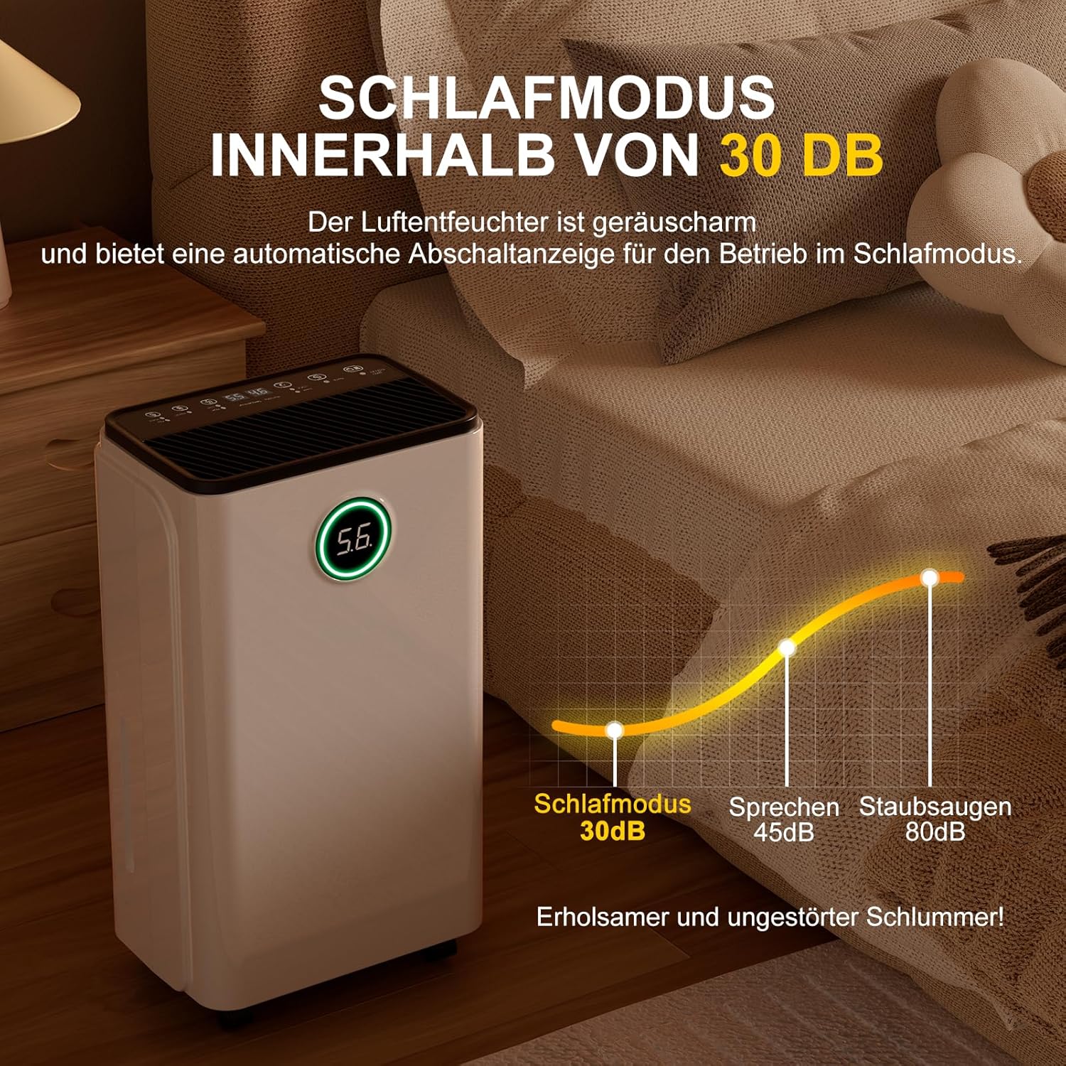• 【3 различни режима на работа】3 различни режима на работа Нашият влагоабсорбатор има три режима: интелигентно обезвлажняване, сушене на пране и режим на заспиване, което го прави универсален за различни нужди. Интелигентният режим на обезвлажняване може автоматично да открива и регулира влажността в помещението, за да я поддържа в разумен диапазон. Режимът на сушене на пране изсушава прането бързо и елиминира неприятните миризми, докато режимът на заспиване работи тихо при 35 dB, подобрява качеството на въздуха и поддържа спокоен сън при ниска скорост на вятъра.