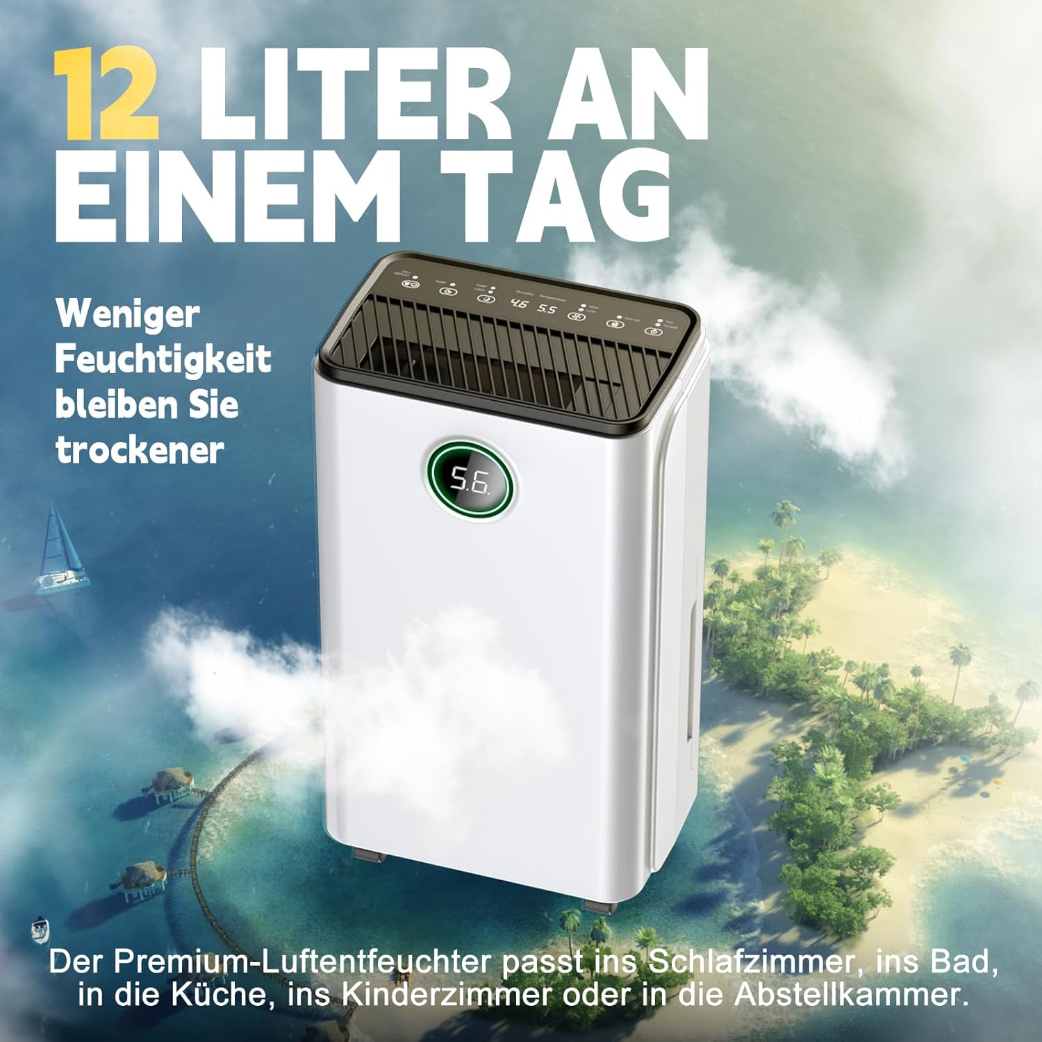 • Особено оптимална регулация на влажността: Омръзна ли ви да имате твърде влажен въздух в дома си? Високата влажност може да причини проблеми като мокри и неприятно миришещи дрехи, мухлясали и изгнили мебели и вредни бактерии. Нашият подобрен влагоабсорбатор с вграден въздушен компресор премахва до 12 литра влага, докато въздухът циркулира в стаята. Той е незаменим домакински помощник за подобряване и освежаване на въздуха в помещения от 15 до 60 м², включително спални, бани, кухни, детски стаи или складови помещения.