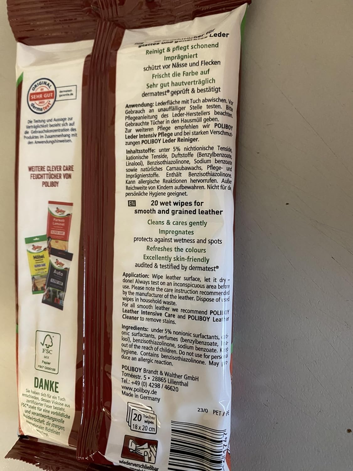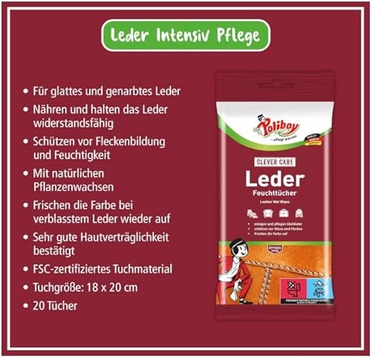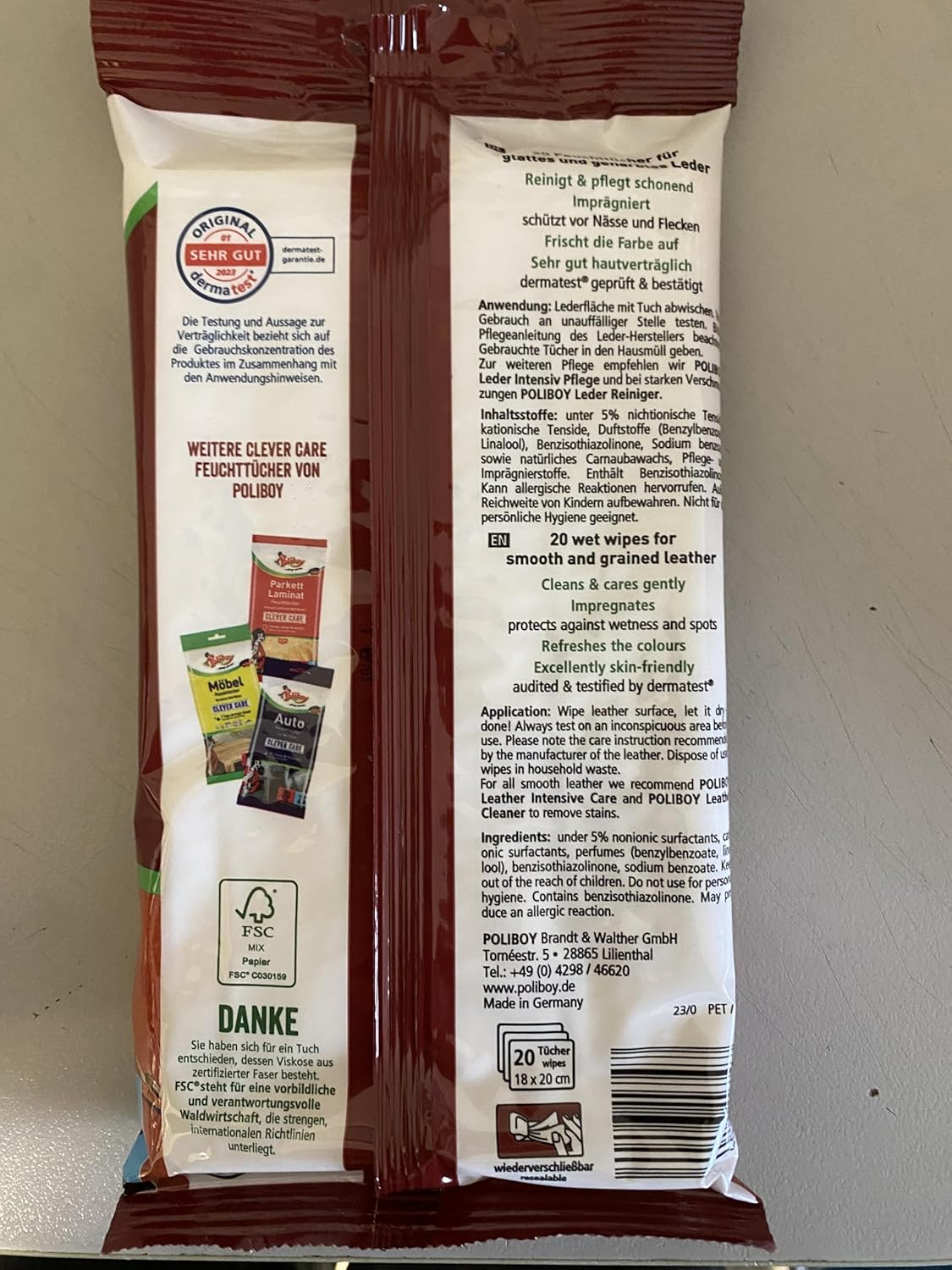 • Аромат на кожа Марка Poliboy ... грижи се като нов Брой листове 20 Информация за опаковката Форма на торбичката Кърпички Препоръчителна повърхност Мебели Брой артикули 2
