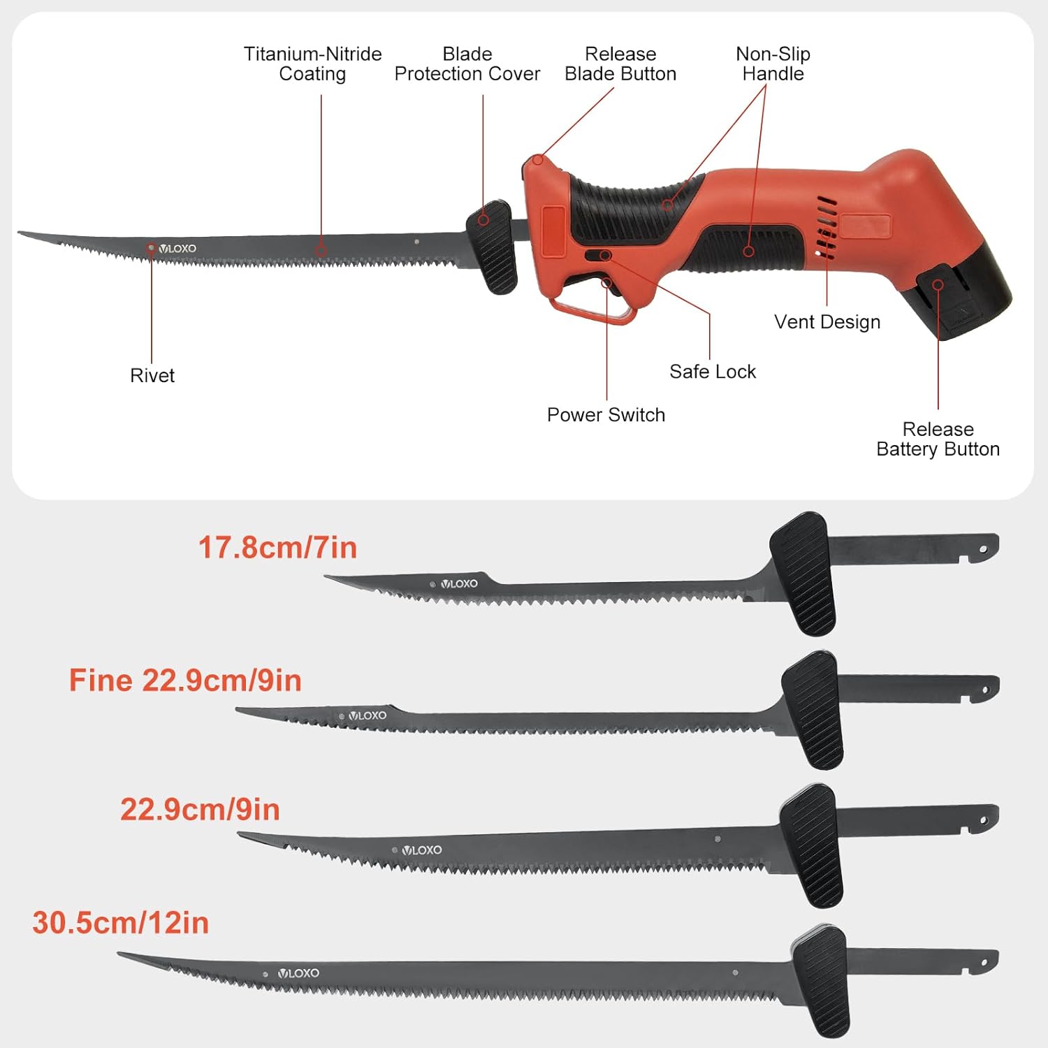 VLOXO Електрически нож, акумулаторен нож за месо с 4 двойни остриета от неръждаема стомана и отвор за охлаждане, електрическо устройство за рязане на замразени храни, неплъзгаща се дръжка, безжичен кухненски нож, предпазен превключвател