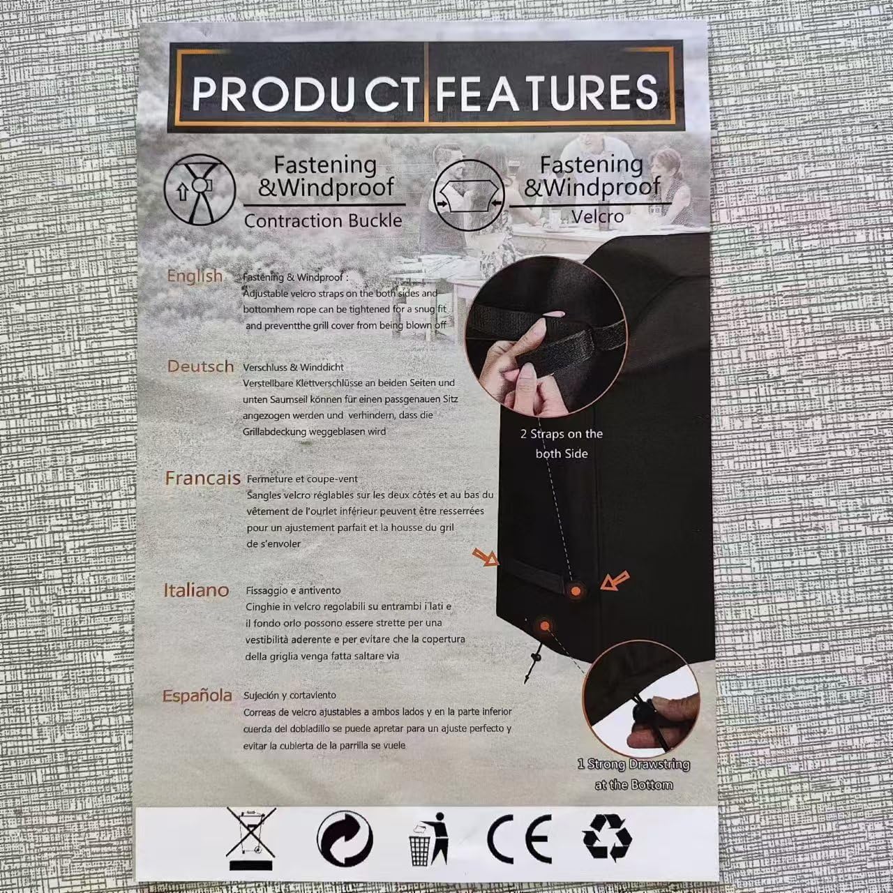 С помощта на велкро закопчалката от двете страни и закрепващите ленти отдолу, можете да позволите на капака на газовата скара да пасне перфектно на вашата скара, за да предотврати отвяването ѝ от вятъра, така че вашата скара да бъде по-добре защитена.