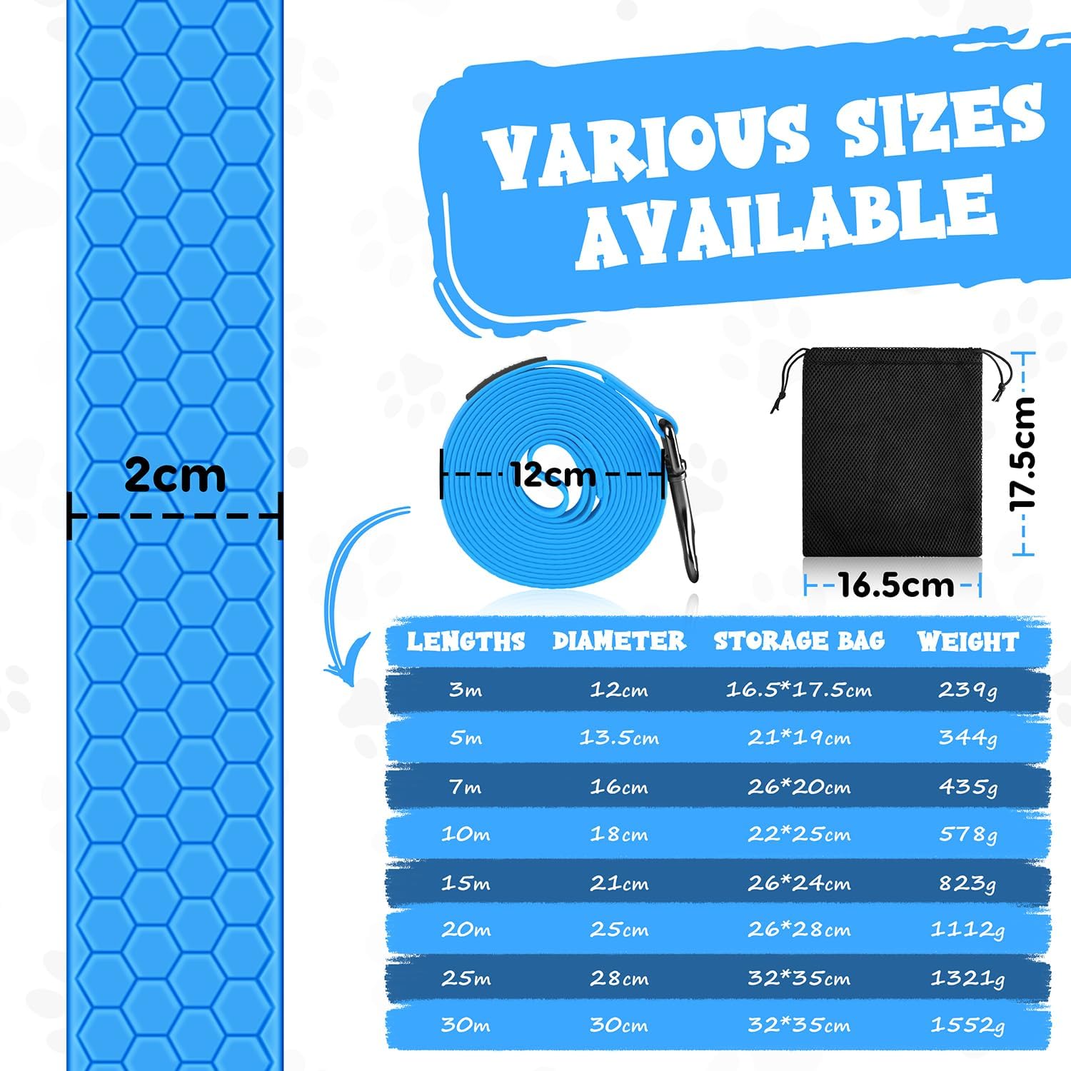 • 3-30 м, няколко цвята за избор: Късият повод за бягане е подходящ да вземете кучето си със себе си в града или на оживени места, за да предотвратите изгубване или нараняване на кучето. Средният повод за привикване е подходящ за тренировки по проследяване или ежедневни разходки, дългият повод за куче е подходящ за полета, гори, пасища и др., за да може кучето ви да тича.