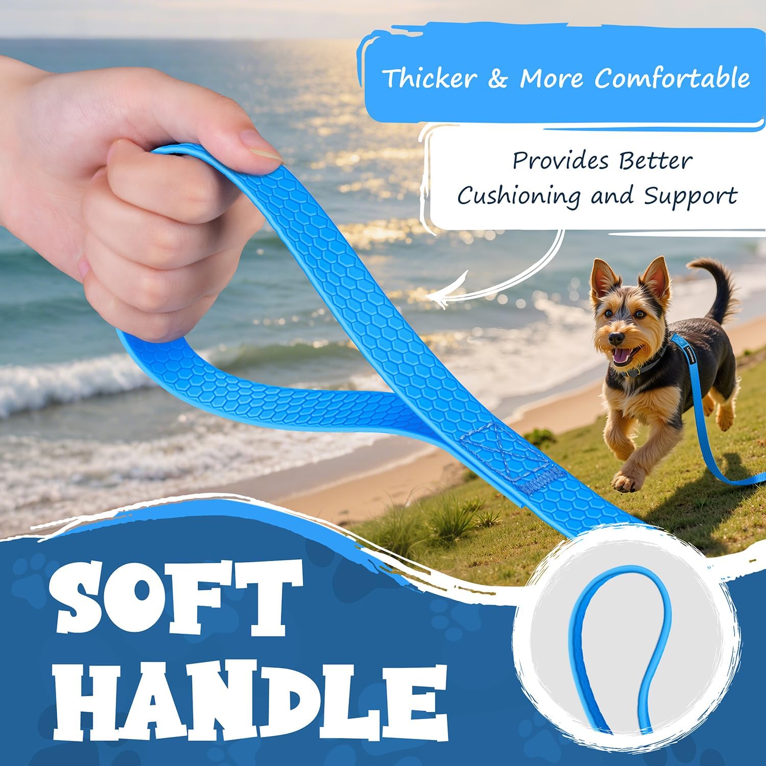 • Ергономична дръжка и въртящ се на 360° карабинер: Дръжката на повода за кучета е снабдена с мека памучна подплата, която може да намали натиска върху ръцете ви, позволявайки на вас и вашето куче да играете на открито дълго време. Въртящият се на 360° карабинер е лек, здрав и може бързо да се прикрепи към нашийника, без да се отваря. Така кучето ви е в безопасност и все още може да души наоколо.