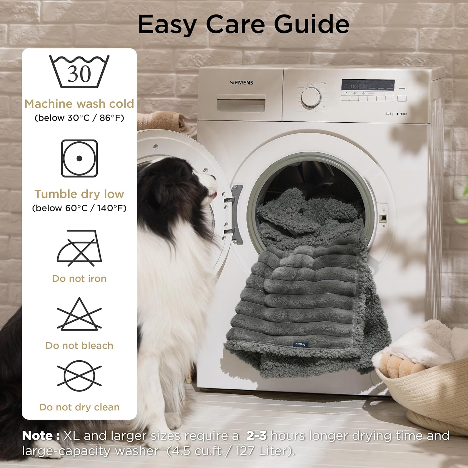 • ВОДОУСТОЙЧИВА И УСТОЙЧИВА НА ПЕТНА ВЪТРЕШНОСТ Вътрешният слой на нашето одеяло за кучета е с водоустойчив дизайн, който ефективно предотвратява проникването на течности от шерпа плата в кадифения полар. Що се отнася до уютната атмосфера, ние ценим не само пухкавите и стилни аксесоари за домашни любимци, но и функционалността, и лесната грижа.