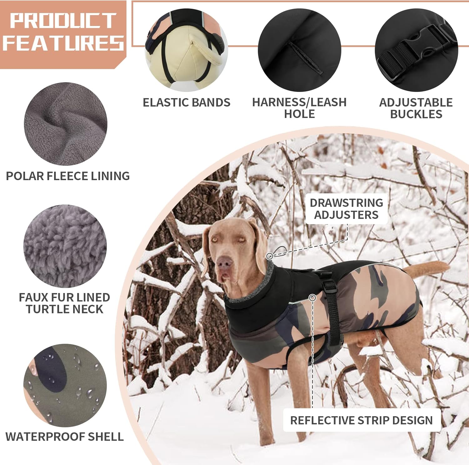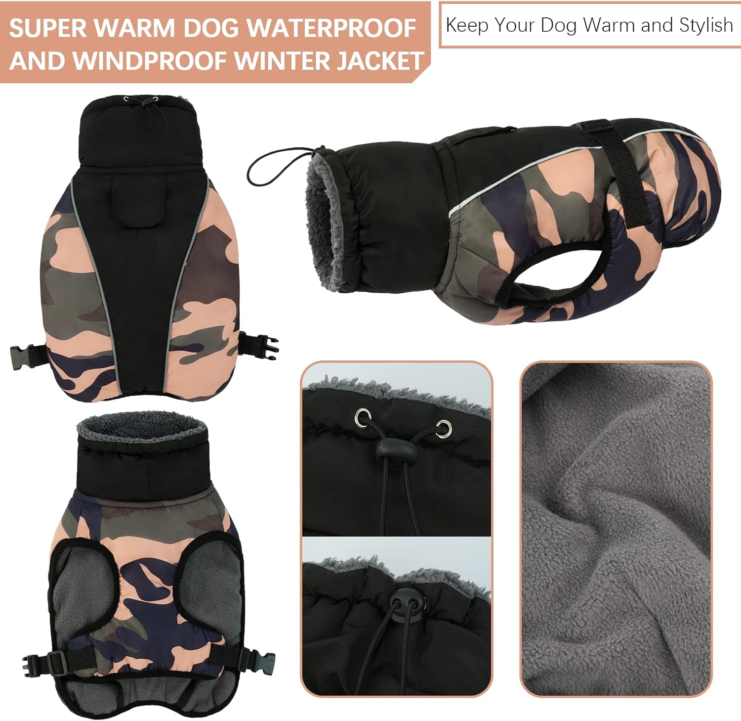 Waterproof shell – the outer material is windproof, waterproof and breathable. Polar fleece lining – warm, comfortable fleece lining. With faux fur lined roll collar – the humanised turtleneck can be opened and closed if necessary and provides additional weather protection when the wind refreshes. Reflective strip design: To keep the safety of dogs during outdoor activities at night, so you can quickly identify dogs in the dark. Harness/leash hole: You can also attach a dog lead to the opening, comfortable to walk dogs. Suitable for most breeds: 6 sizes with 6 designs, from S-3XL.