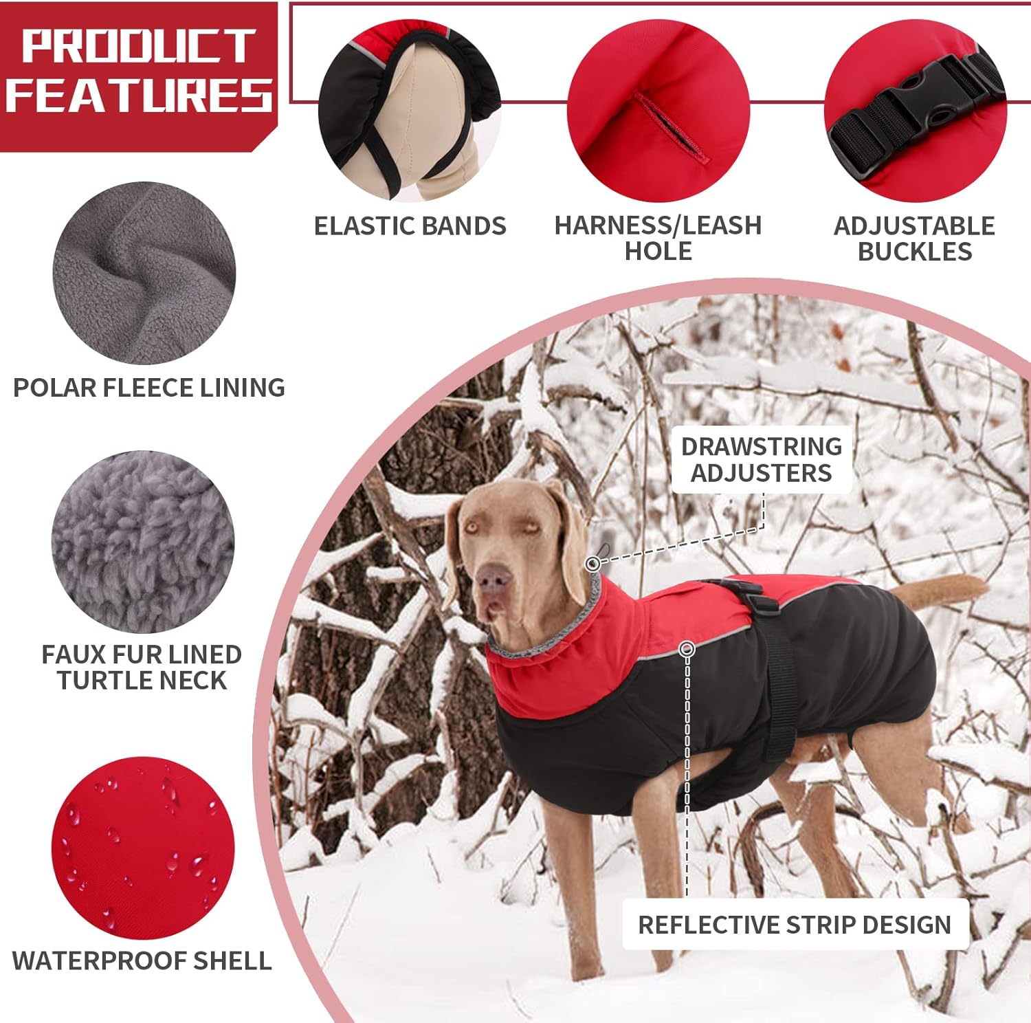 Waterproof shell – the outer material is windproof, waterproof and breathable. Polar fleece lining – warm, comfortable fleece lining. With faux fur lined roll collar – the humanised turtleneck can be opened and closed if necessary and provides additional weather protection when the wind refreshes. Reflective strip design: To keep the safety of dogs during outdoor activities at night, so you can quickly identify dogs in the dark. Harness/leash hole: You can also attach a dog lead to the opening, comfortable to walk dogs. Suitable for most breeds: 6 sizes with 6 designs, from S-3XL.