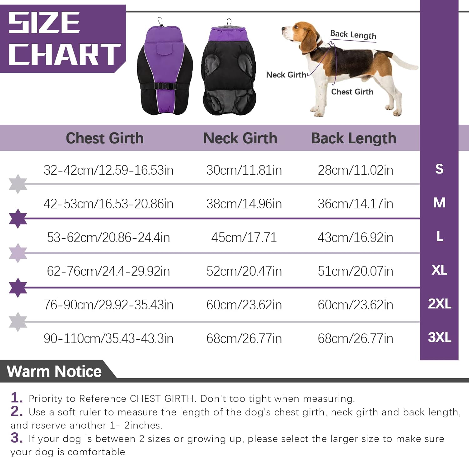 Please make sure you measure the size of your dog before choosing a dog coat in the right size, especially the neck and chest size. The above table can help you choose the right size. If your dog is between two sizes, we recommend choosing one size larger. Every furry friend with different sizes, and if your pet usually wears size S, this does not mean that the size S fits him.