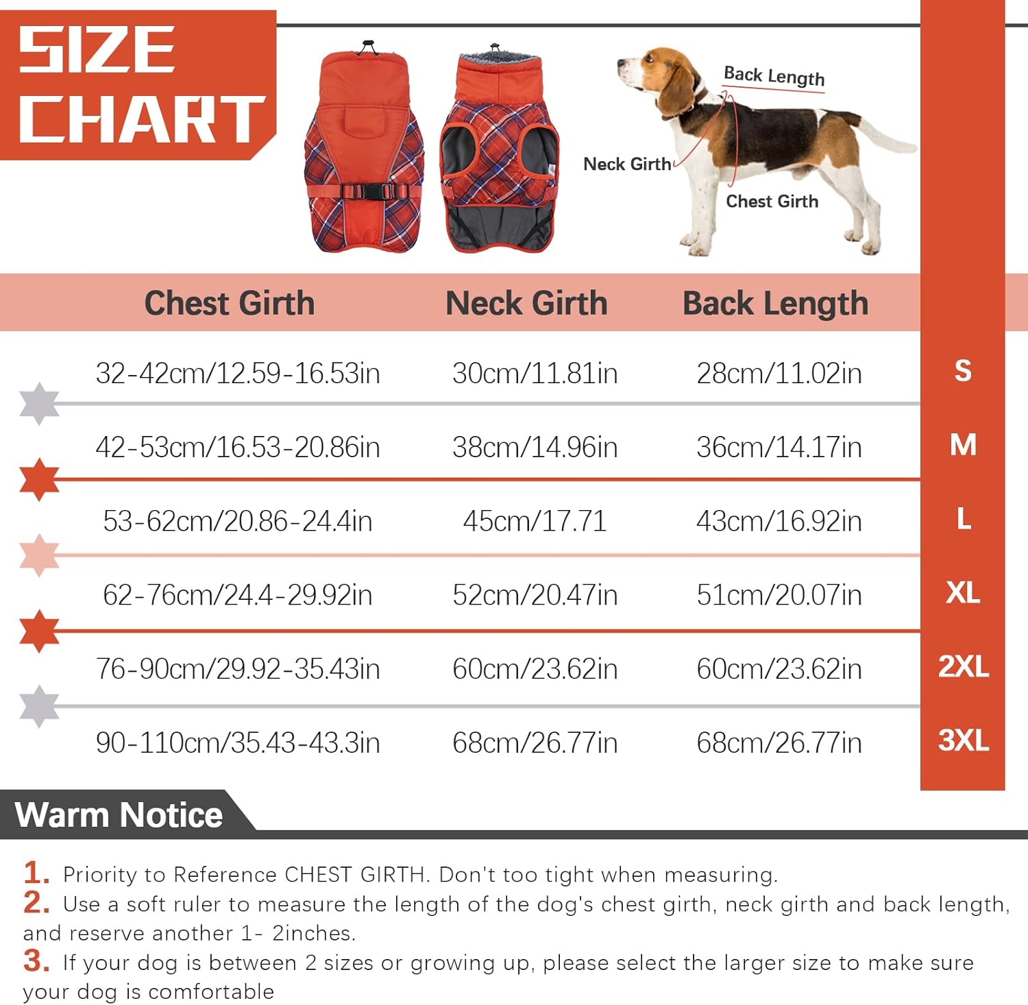 Please make sure you measure the size of your dog before choosing a dog coat in the right size, especially the neck and chest size. The above table can help you choose the right size. If your dog is between two sizes, we recommend choosing one size larger. Every furry friend with different sizes, and if your pet usually wears size S, this does not mean that the size S fits him.