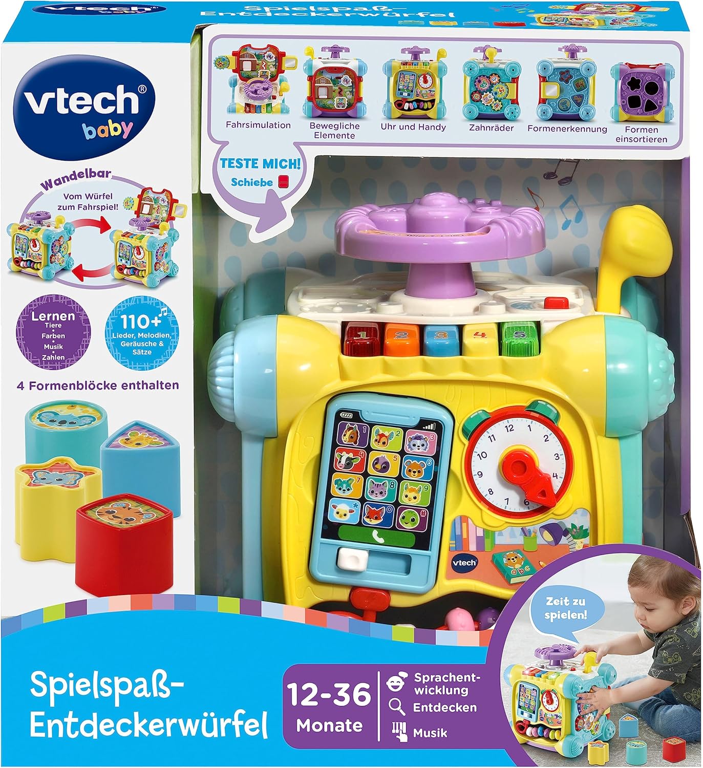 • Съдържание на кутията: 1 x Vtech бебешки забавен изследователски куб, отделение за батерии, безопасно за деца, контрол на силата на звука и автоматично изключване, немска версия, възраст: 12-36 месеца, 2 x AA/LR6 демо батерии, артикулен номер: 80-557204