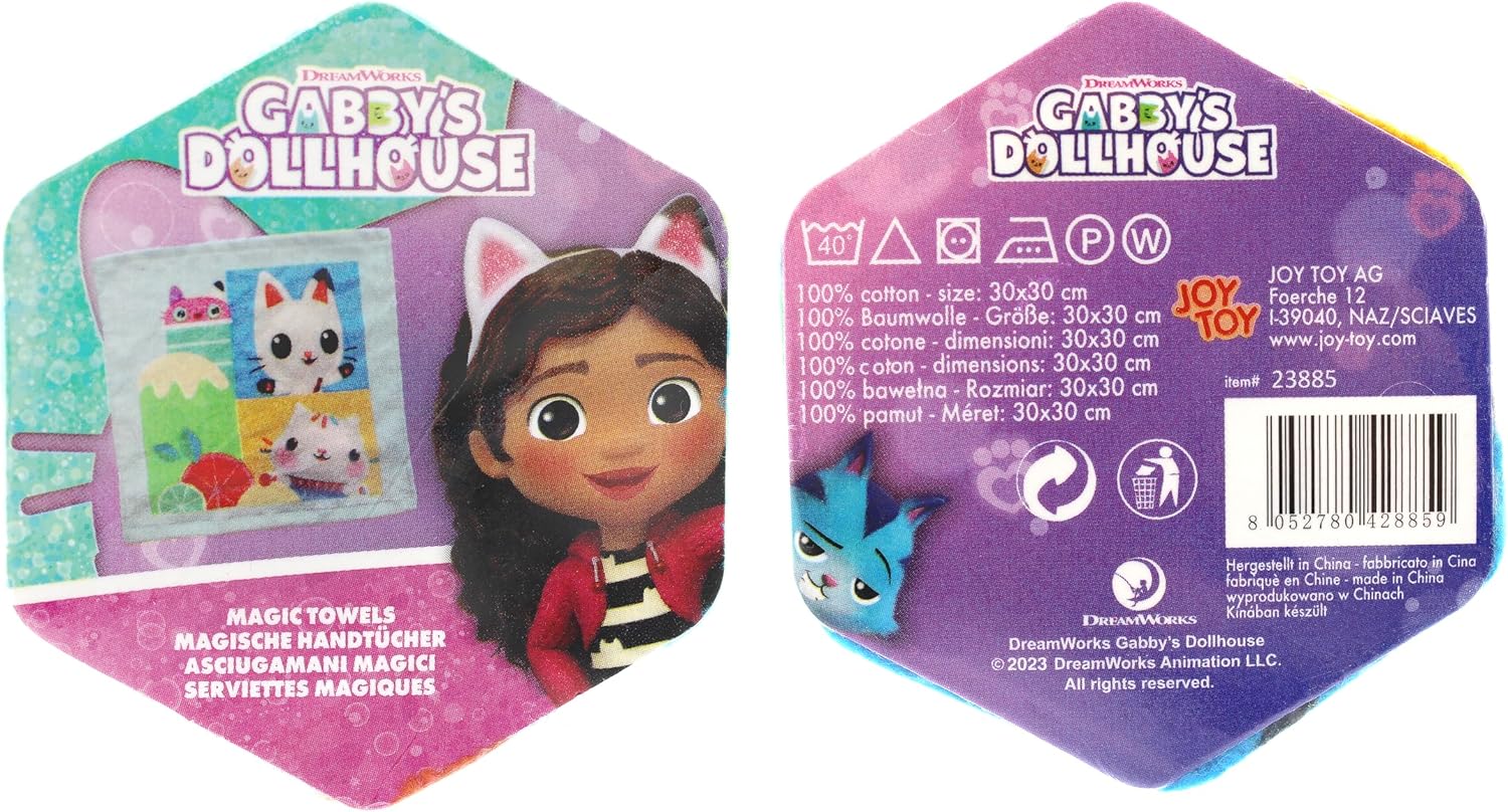 Вълшебна кърпа „Къщичка за кукли на Габи“ Размер на отворената кърпа: приблизително 30 x 30 см - компресирана кърпа: 4,7 x 5,3 x 1,8 см - 4 различни дизайна с готини мотиви от „Къщичката за кукли на Габи“ - компресираната кърпа расте в топла вода до пълния си размер - материал: 100% памук - ще получите 1 брой от тези мотиви на случаен принцип - мотивът не може да бъде избран - чудесна идея за малък подарък. парти сувенири