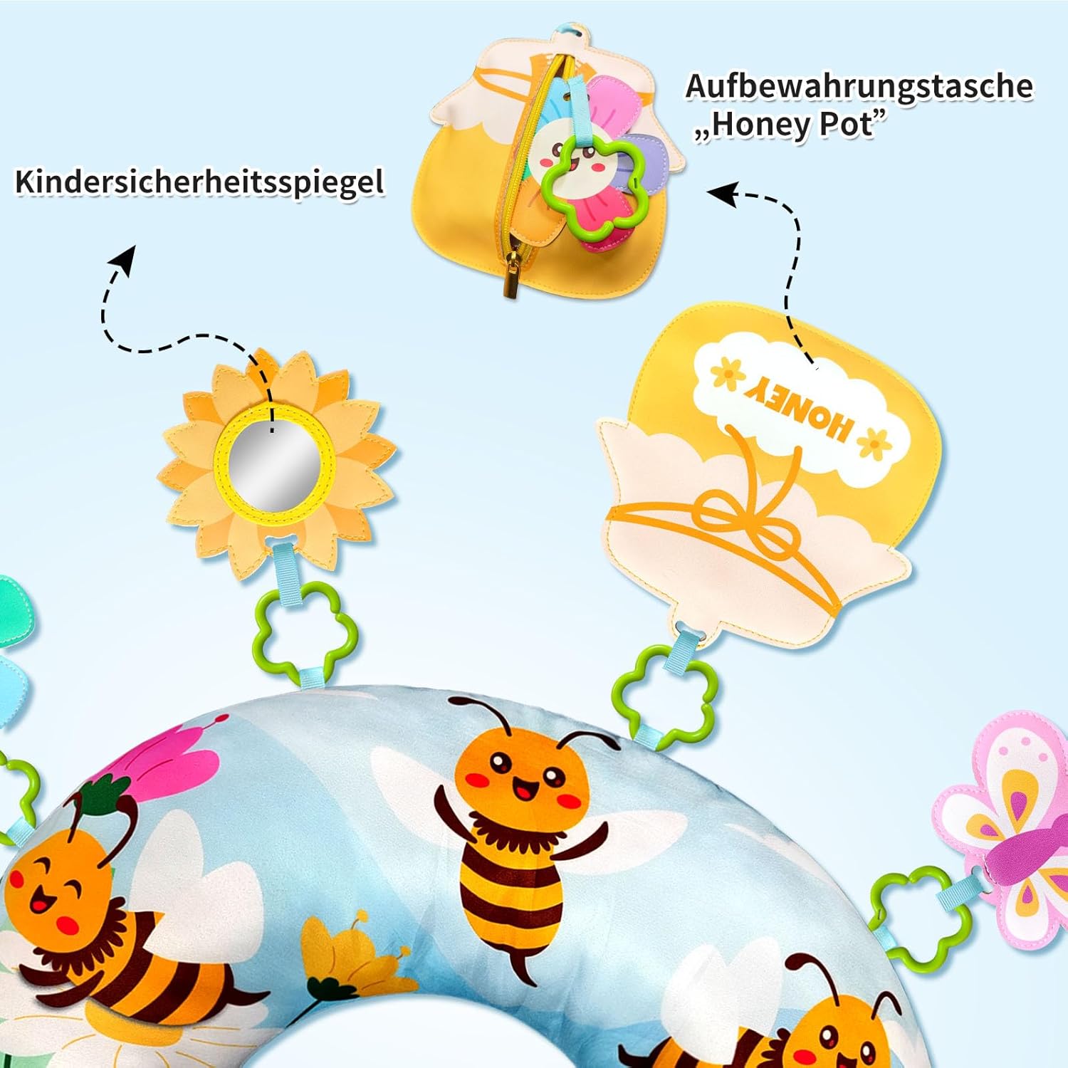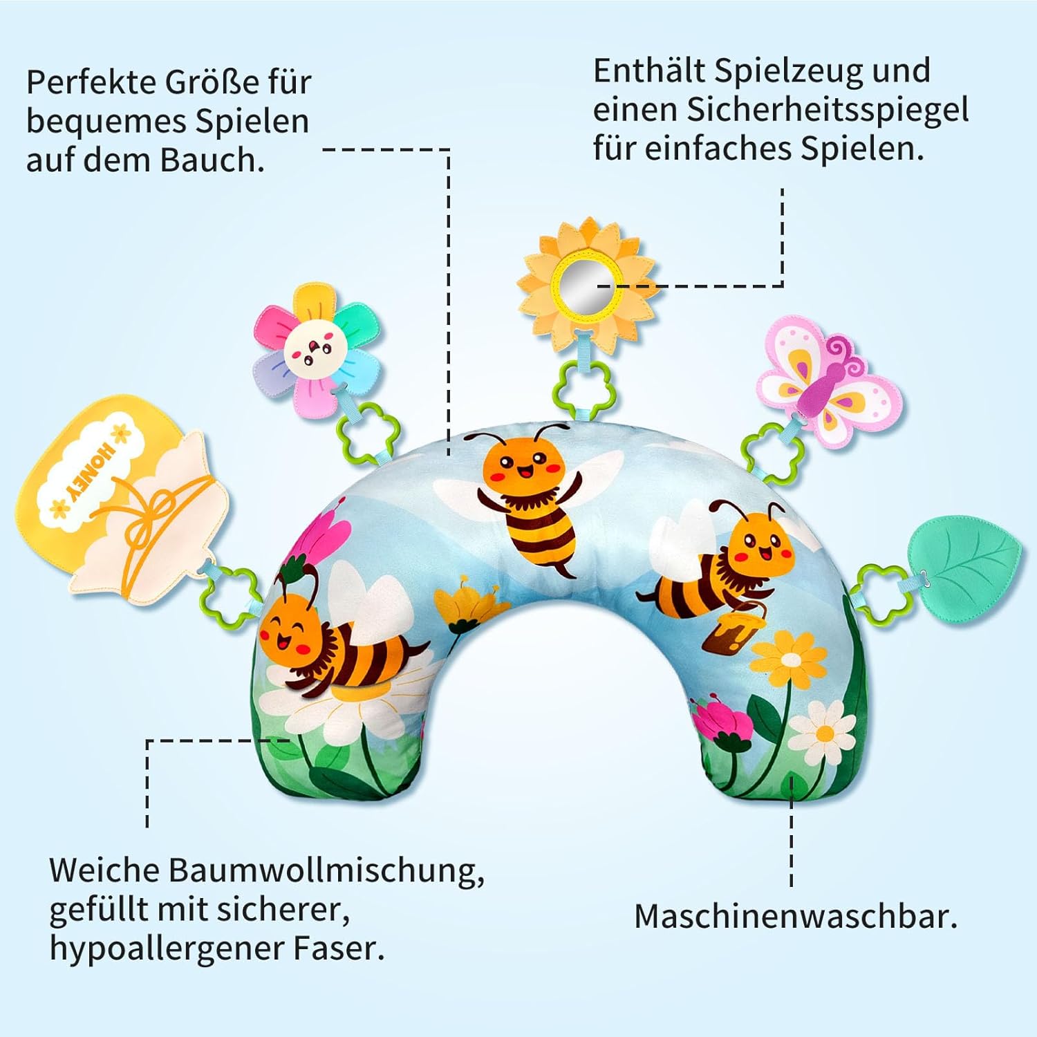 • Фантастична играчка за време на коремче: Цветни шарки, имитиращи живота на пчелите, и стимулиращи истории, които майките могат да разказват на бебетата си за пчелите, които събират нектар. Огледалцето за безопасност, джобчето за саксия с мед и пеперудата са особено привлекателни и насърчават никненето на зъби при новородените, както и желанието им да лежат по корем. Всички подвижни играчки са изработени от мека кожа.