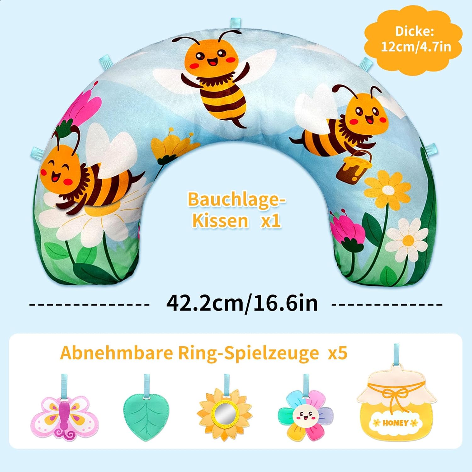 Възглавничка за коремче Bee Baby, сладка възглавничка за коремче за бебета, сензорна играчка с подвижно огледалце във формата на слънчоглед, джоб с цип във формата на саксия с мед, за деца 0-24 месеца