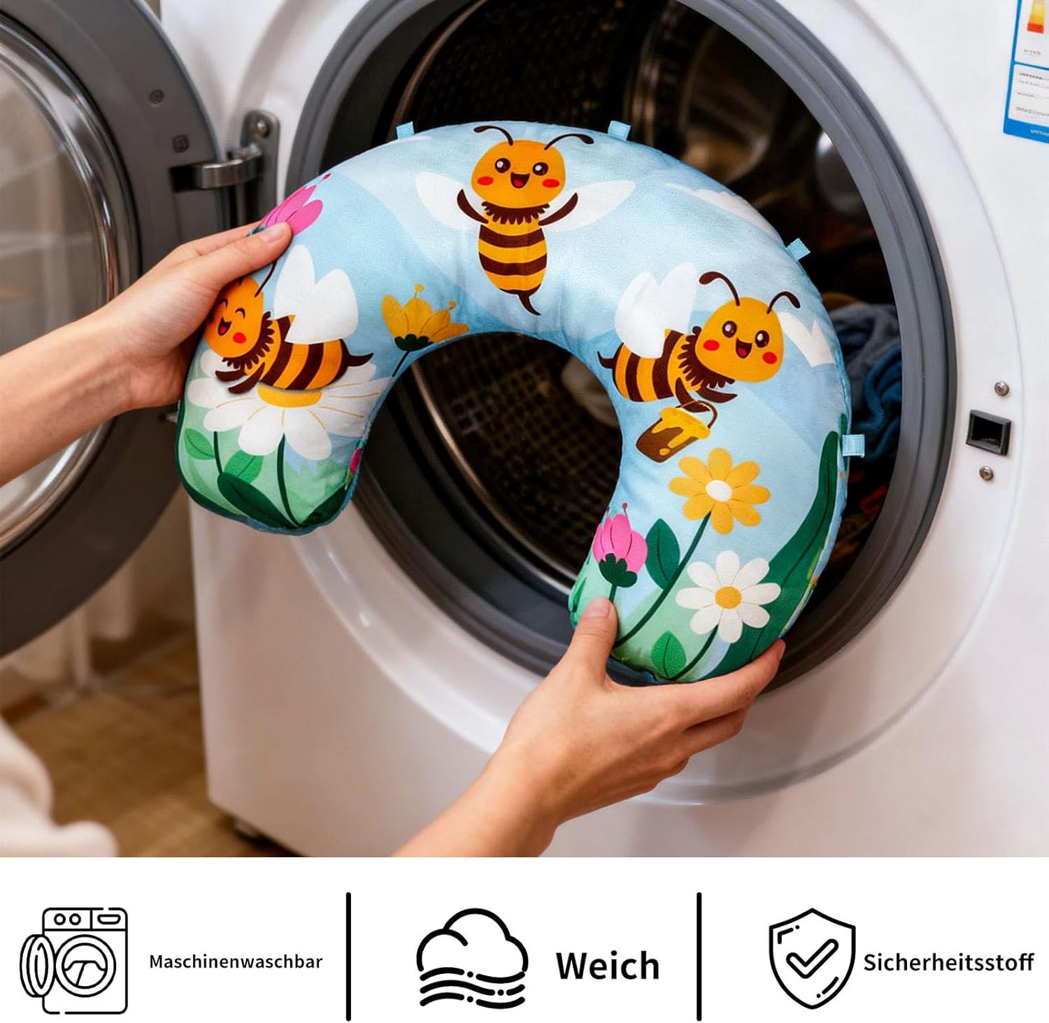 • Подпомага ранното детско развитие: Удобната възглавница Bee Tummy Time служи като опора за новородени, докато са по корем. Тя нежно повдига бебето, разширява зрителното му поле и подпомага развитието на мускулите на врата и раменете. Включени са няколко меки играчки, включително огледалце за безопасност във формата на слънчоглед. Те помагат на бебето ви да се концентрира и да изследва заобикалящата го среда, докато е по корем – идеална подготовка за пълзене.
