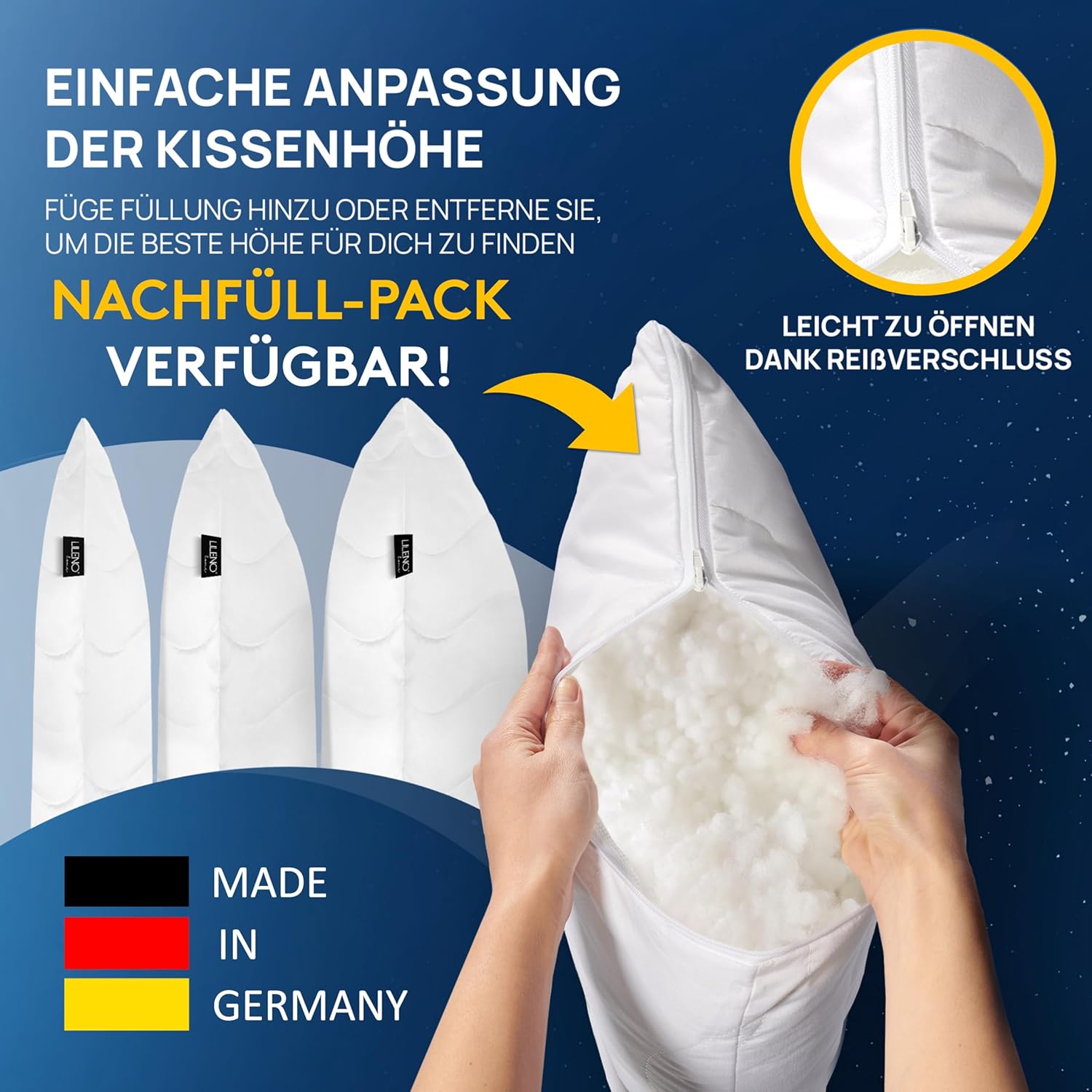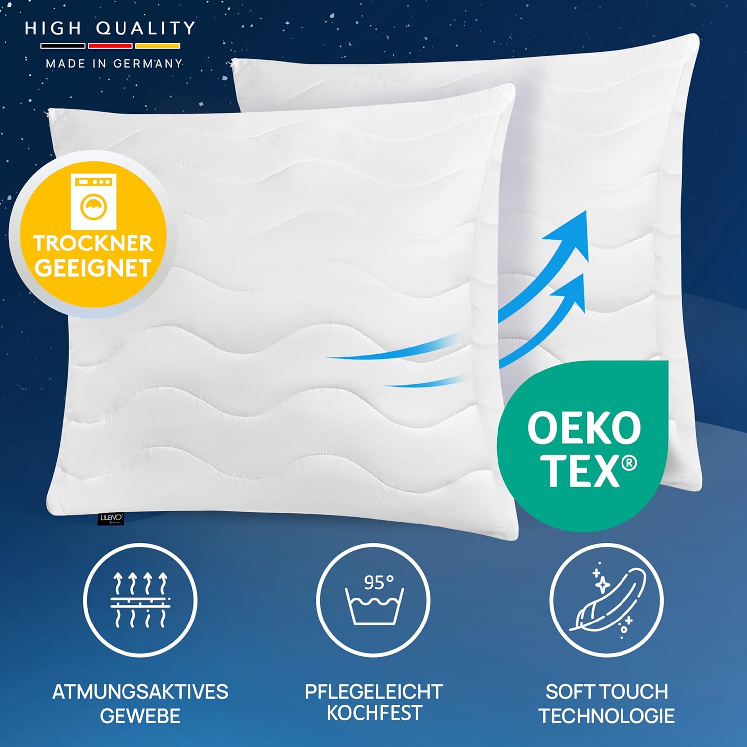 • Подходящо за хора с алергии: Нашите възглавници, сертифицирани по Oeko-Tex 100, могат да се перат на 95°C и са тествани за вредни вещества. Висококачествените и удобни вълнообразни шевове също са изработени от хипоалергенен микрофибър.