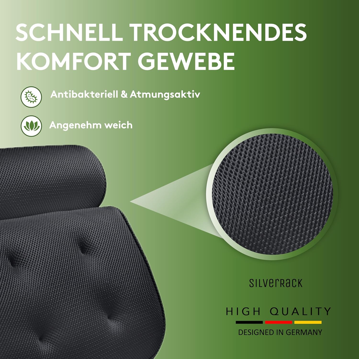 • Висококачествени материали – изработена от мека, дишаща 3D мрежа, тази възглавница за вана предлага приятна повърхност. Многослойният пълнеж осигурява допълнителен комфорт.