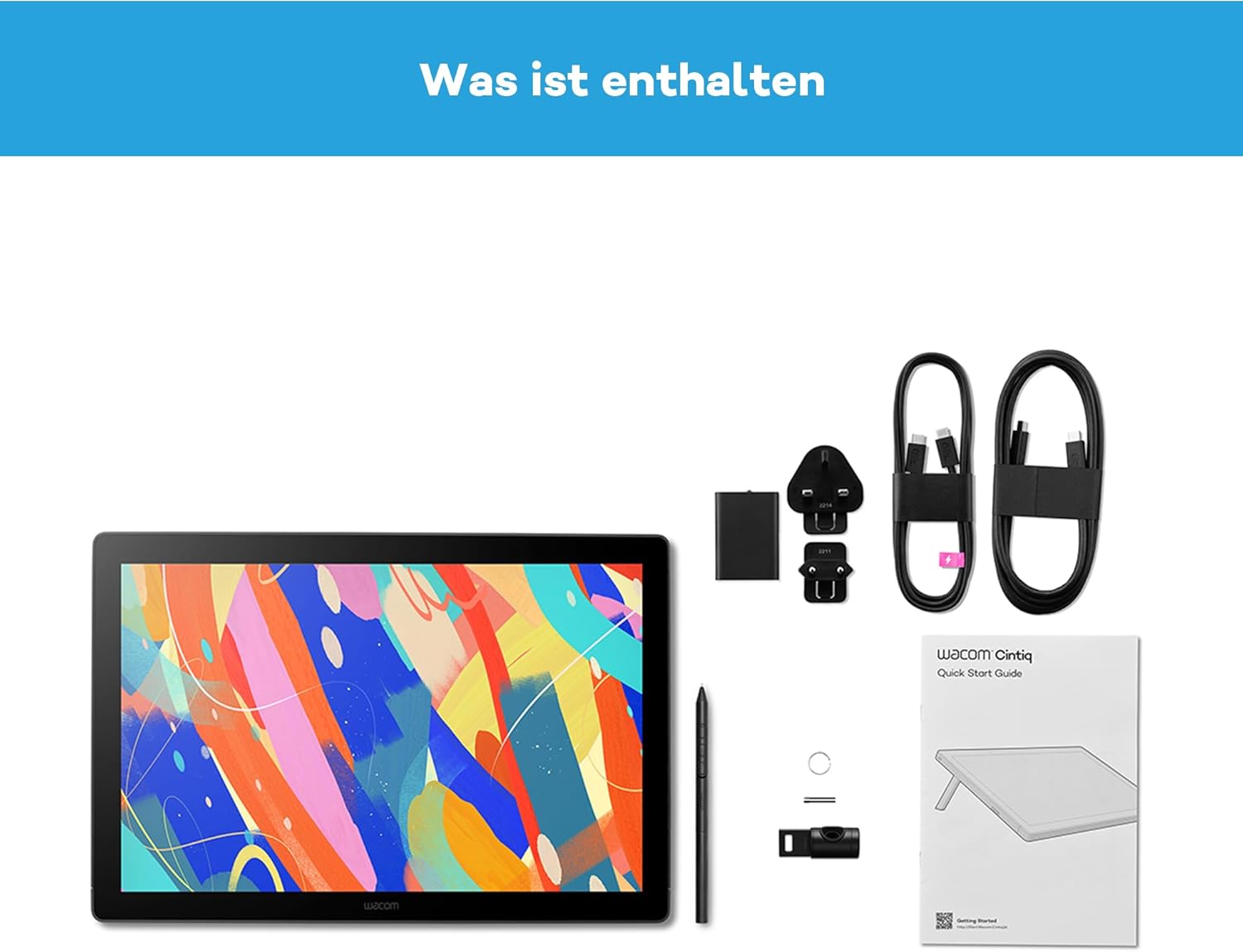 Kabel verbinden dein Display mit dem Computer und übertragen Video, Stiftdaten und Strom. Beim Wacom Cintiq 16 übernimmt das mitgelieferte USB-C-Kabel alles – vorausgesetzt, dein Rechner hat USB-C mit DisplayPort Alt Mode oder Thunderbolt 3/4. Fehlt ein passender Anschluss, brauchst du eventuell zusätzliche Kabel wie HDMI auf Mini-HDMI (Video) und USB-A auf USB-C (Stiftdaten).