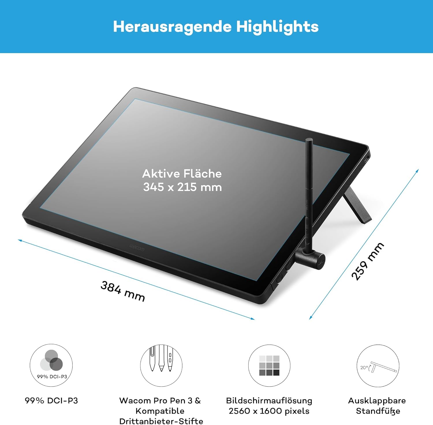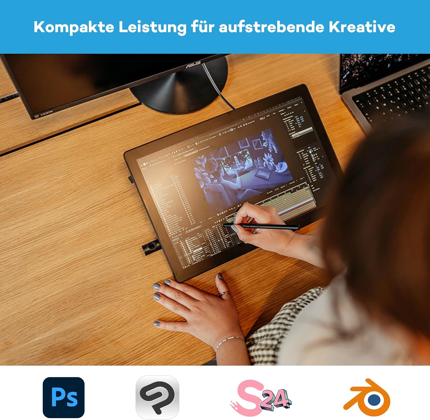 Das Wacom Cintiq 16 bietet das ideale Gleichgewicht zwischen großzügigem Bildschirm und kompakter Größe. Mit 16-Zoll-Display und einer aktiven Fläche von 345 x 215 mm ist es perfekt für kleinere oder geteilte Arbeitsplätze geeignet. Die schlanke Umrandung maximiert deine kreative Fläche – ideal für Fotoeditor*innen, die Wert auf Kontrolle und Präzision legen.